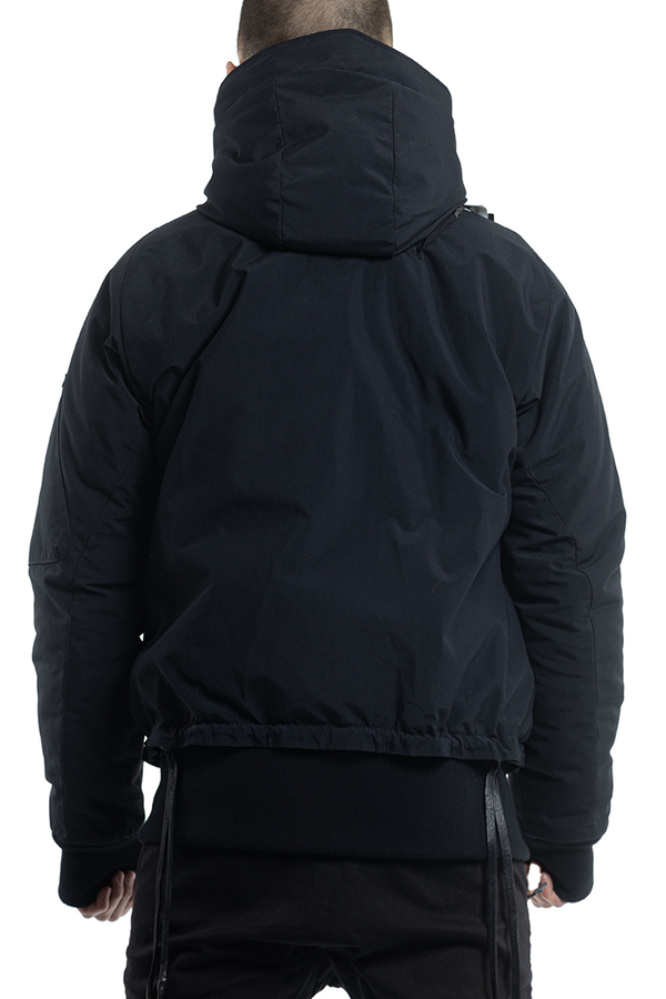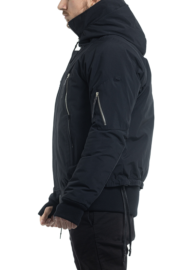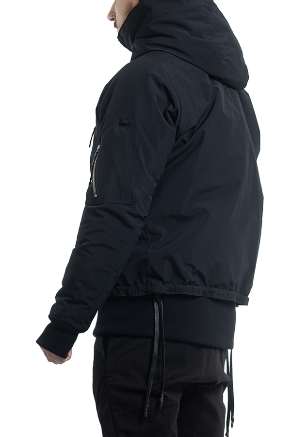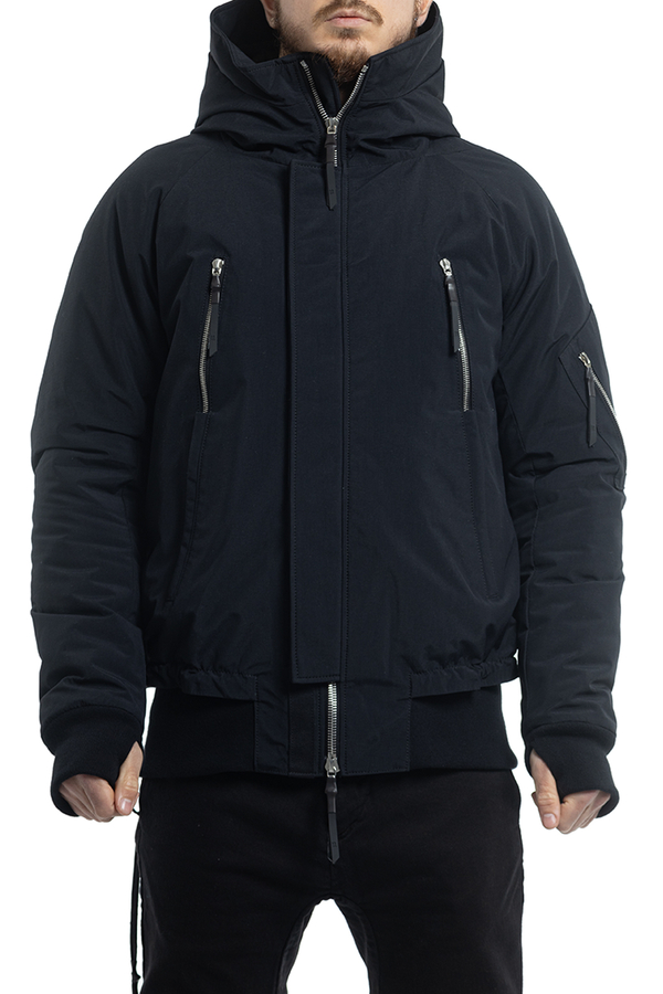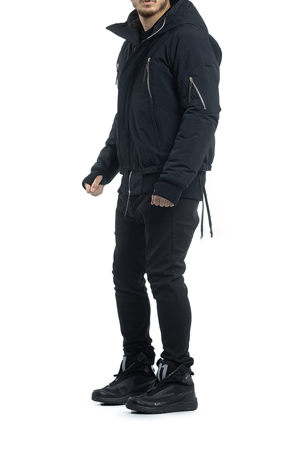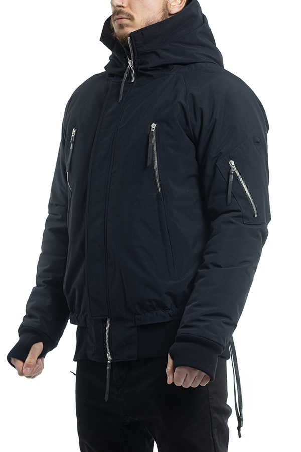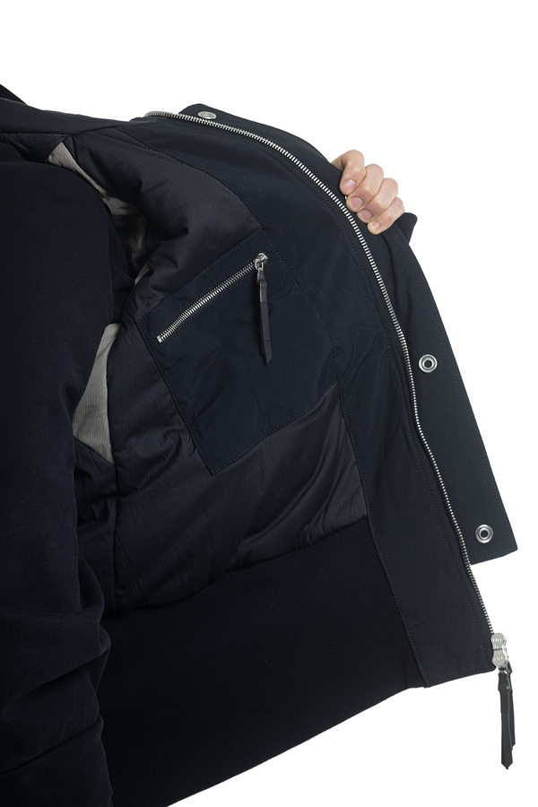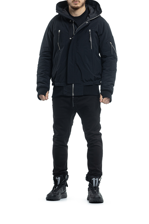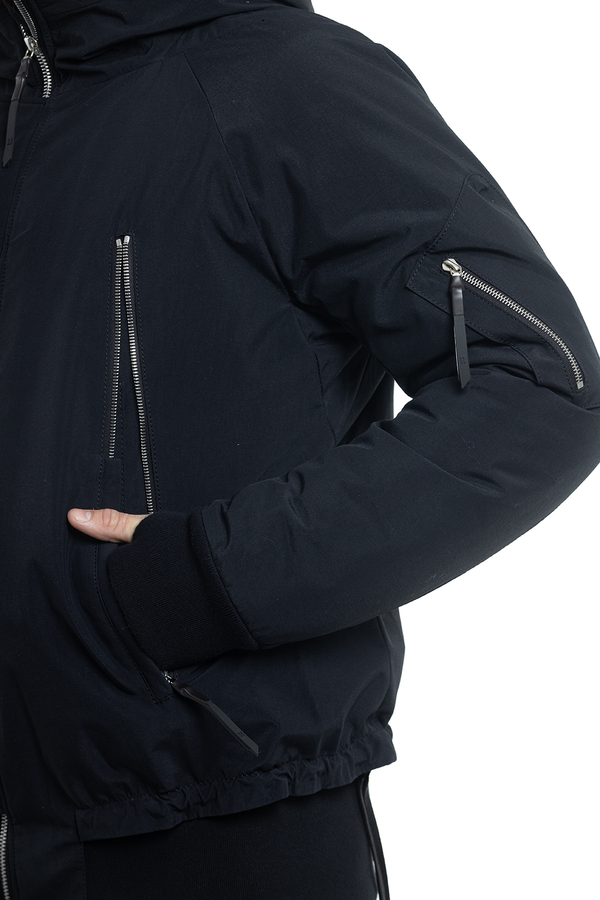 - Куртка з каптуром, спереду застібка на блискавку та кнопки, дві прорізні кишені на блискавках спереду, одна на рукаві та одна внутрішня кишеня, еластичні манжети, низ на шнурку