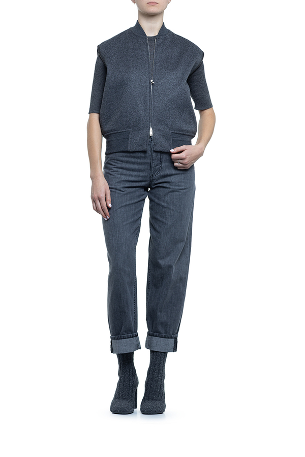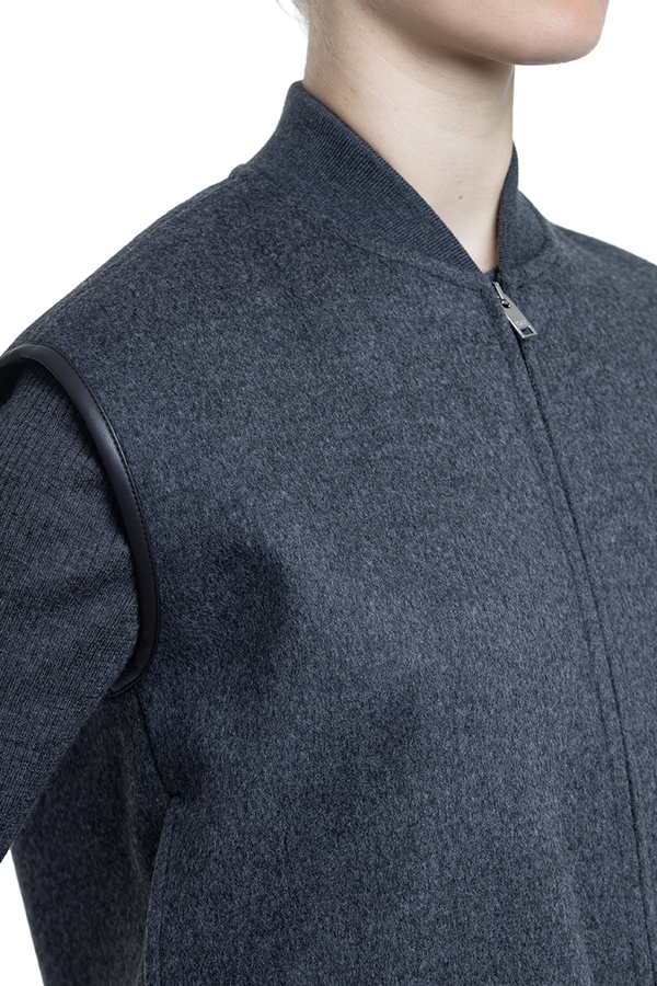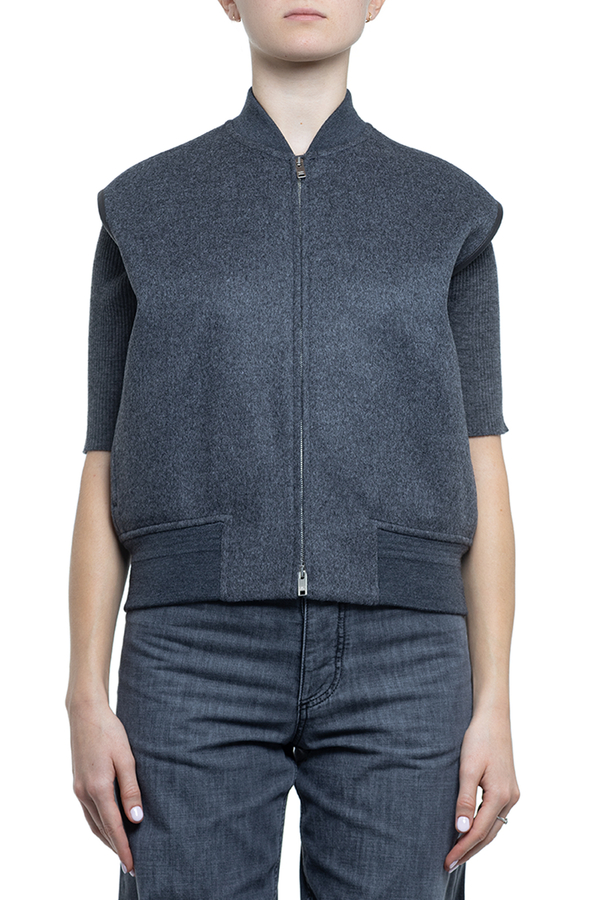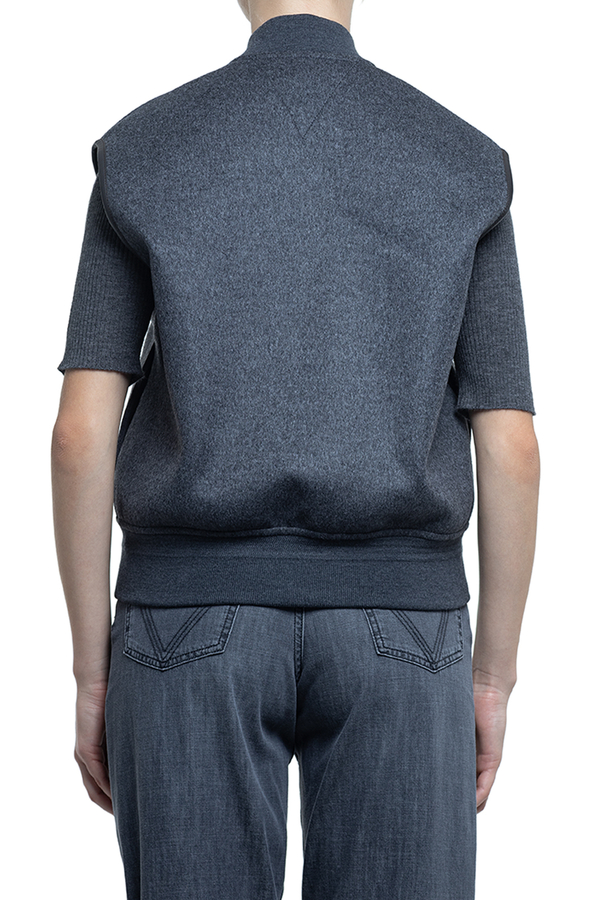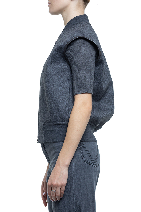 - Жилет з еластичним коміром та низом, дві прорізні кишені у бокових швах, контрастна обробка вирізів для рукавів, застібка на подвійну блискавку