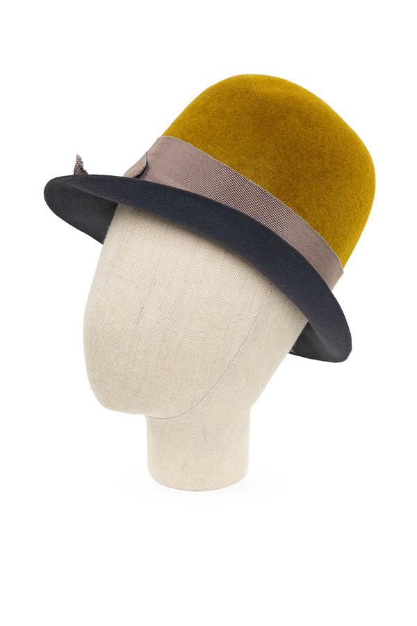 - Фетровий капелюх із стрічкою навколо тулії, збоку металева вставка з логотипом