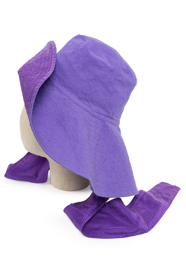 - Капелюх з широкими полями і з зав'язками, з фактурою полотна і шовку.