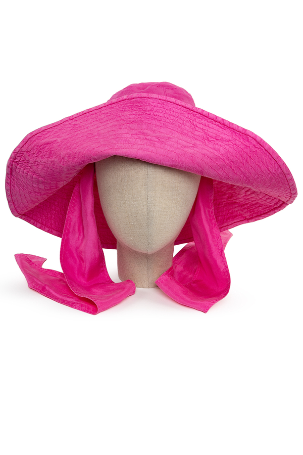 - Капелюх з широкими полями і з зав'язками, з фактурою полотна і шовку.