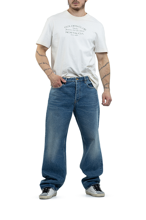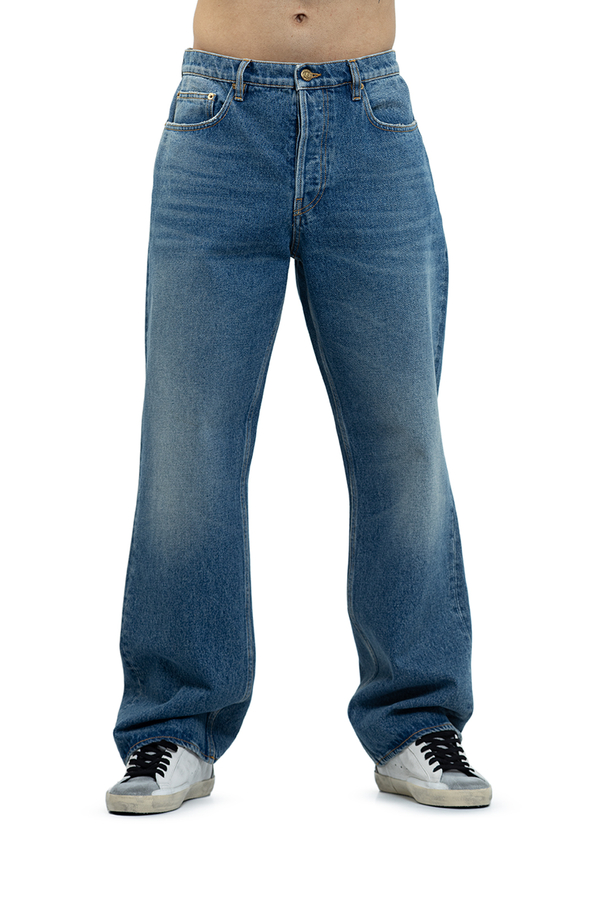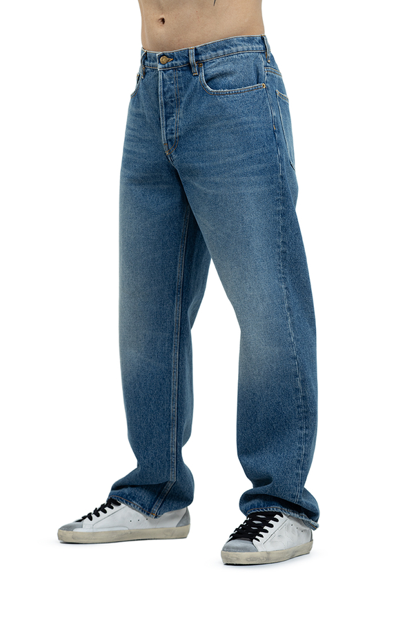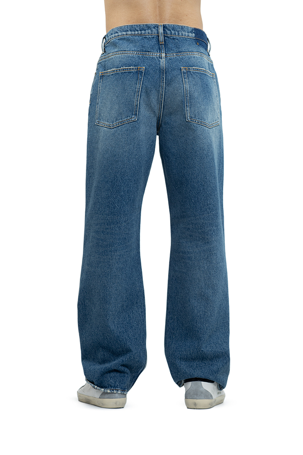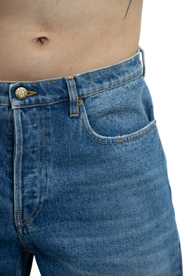 - Джинси з класичними п’ятьма кишенями, ефект потертості, шлевки для ременя, ззаду фірмова подвійна зірочка