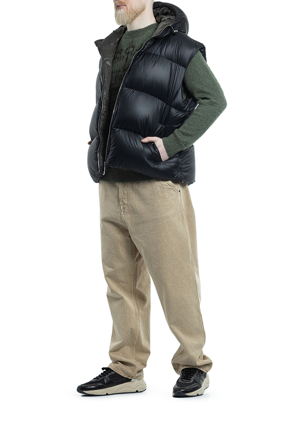 - Стьобаний жилет з капюшоном на кулісі, брендована стрічка ззаду, застібка на блискавку спереду, дві бічні кишені на кнопках, внутрішня кишеня на блискавці, низ на шнурку