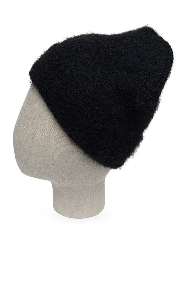 - Шапка-біні з ребристого кашемірового трикотажу, коротка довжина, манжета, шкіряна нашивка LOEWE спереду