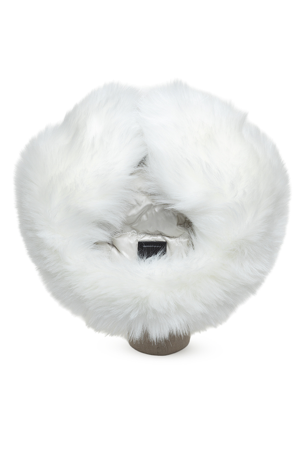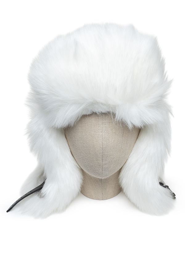 - М'яка дута шапка-авіатор, оздоблений штучним хутром білого кольору, застібка на ремінець з пряжкою, наповнювач з качиного пуху.