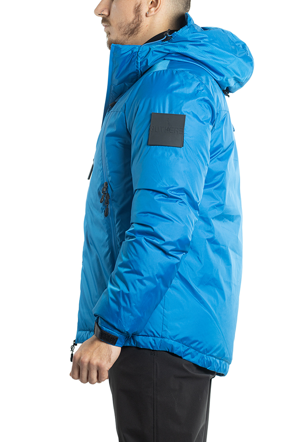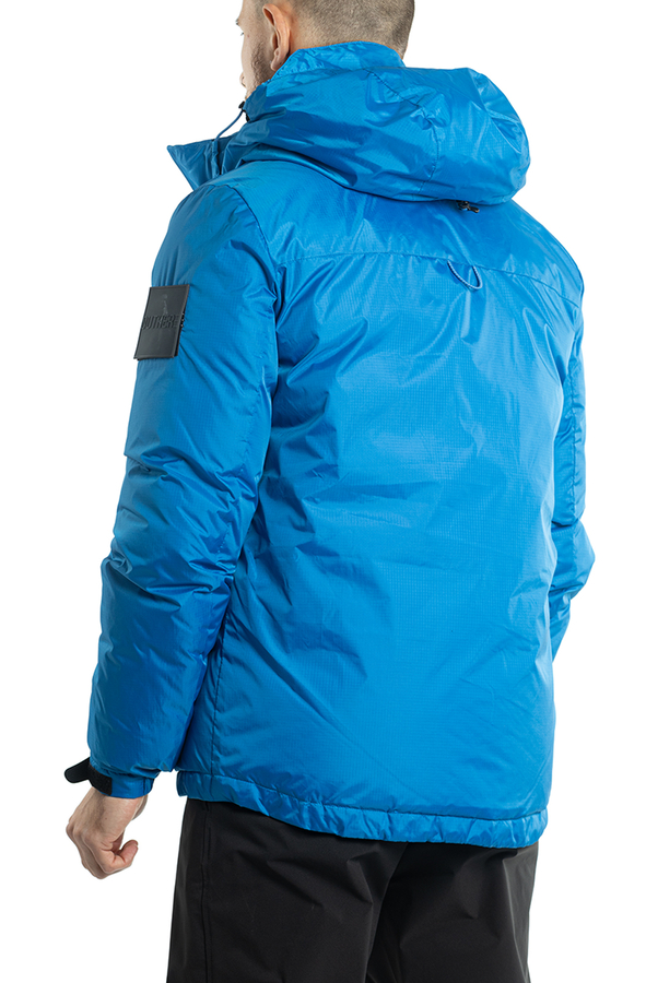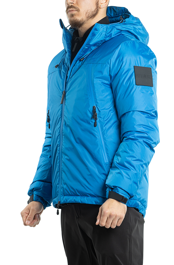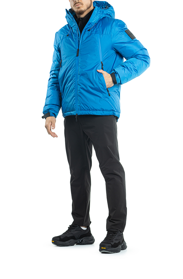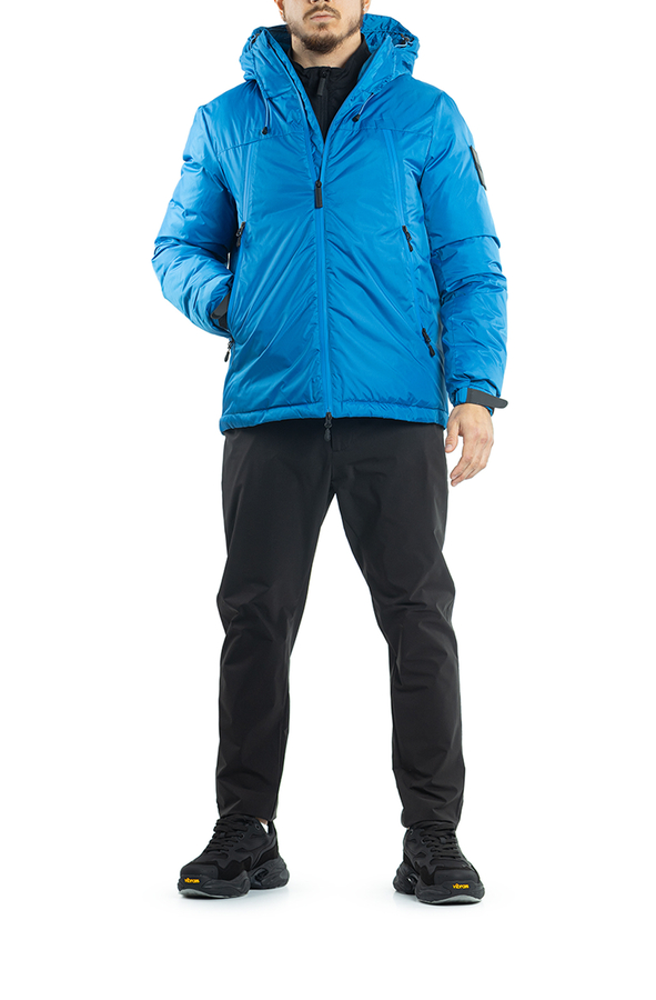 - Пуховик з капюшоном на кулісі, регульовані манжети, спереду застібка та дві прорізні кишені на блискавці з подвійним бігунком
