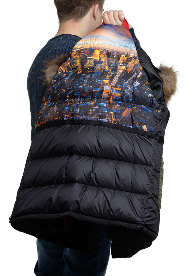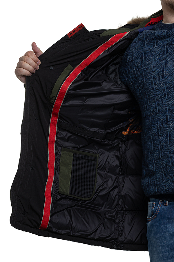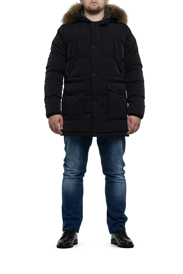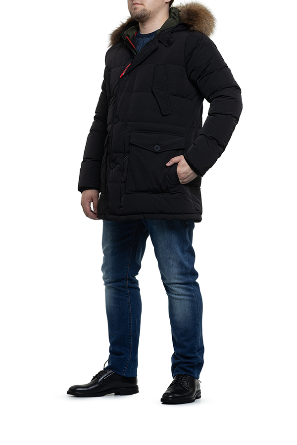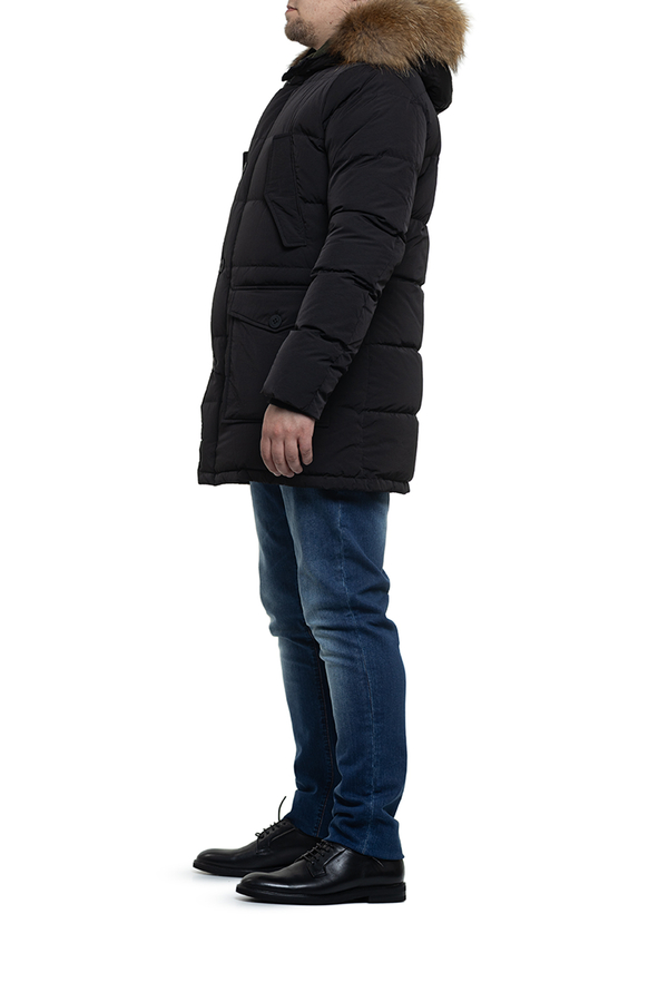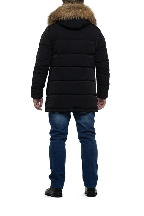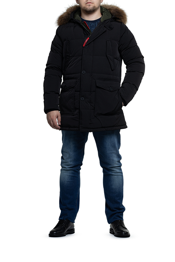 - Парка середньої довжини з хутровим капюшоном. Чотире кишені, застібка на блискавку.