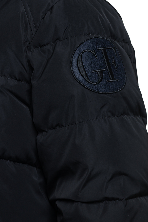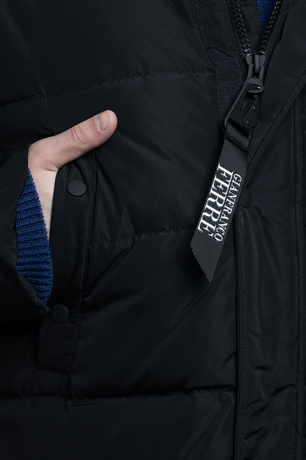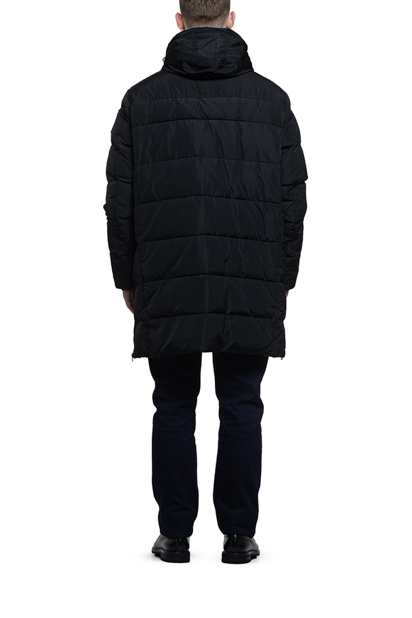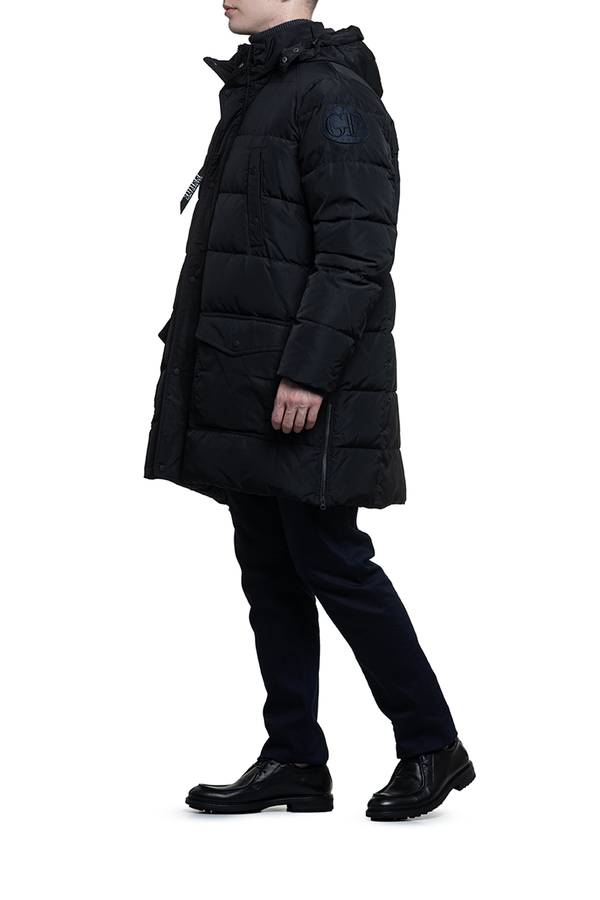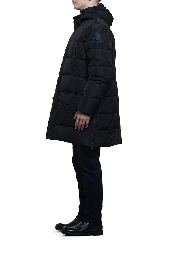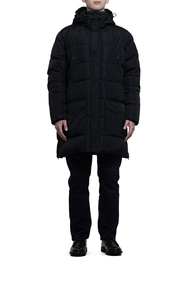 - Довгий пуховик з капюшоном і накладними кишенями.