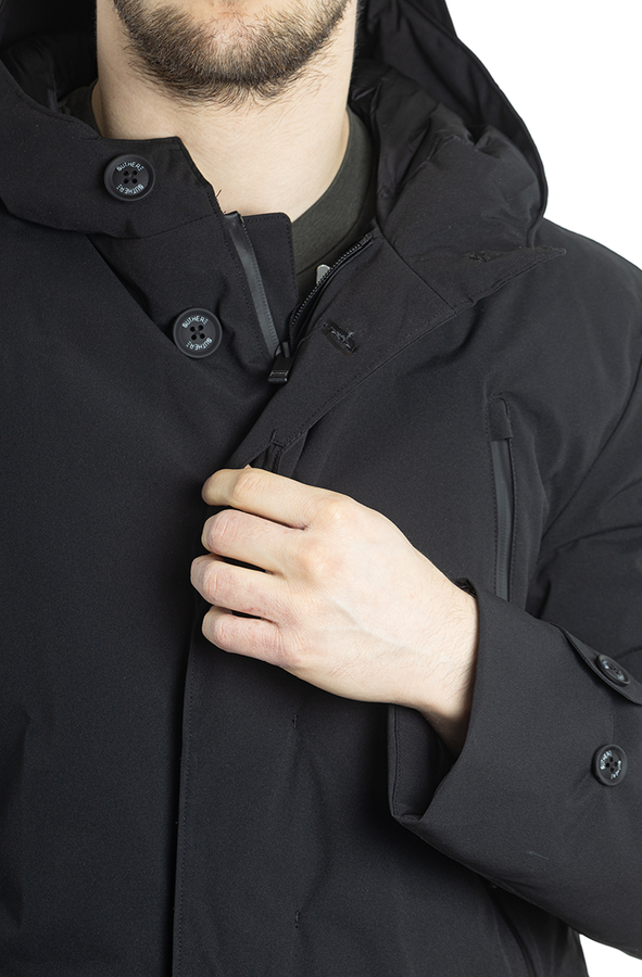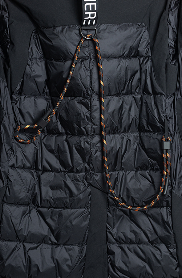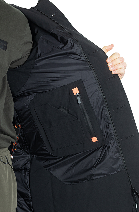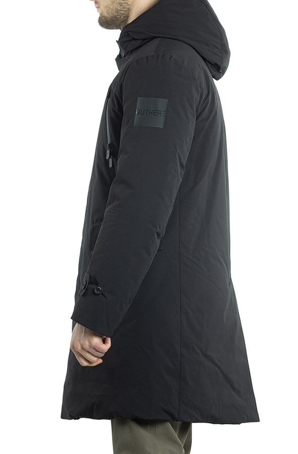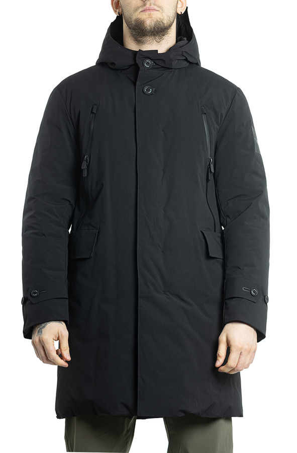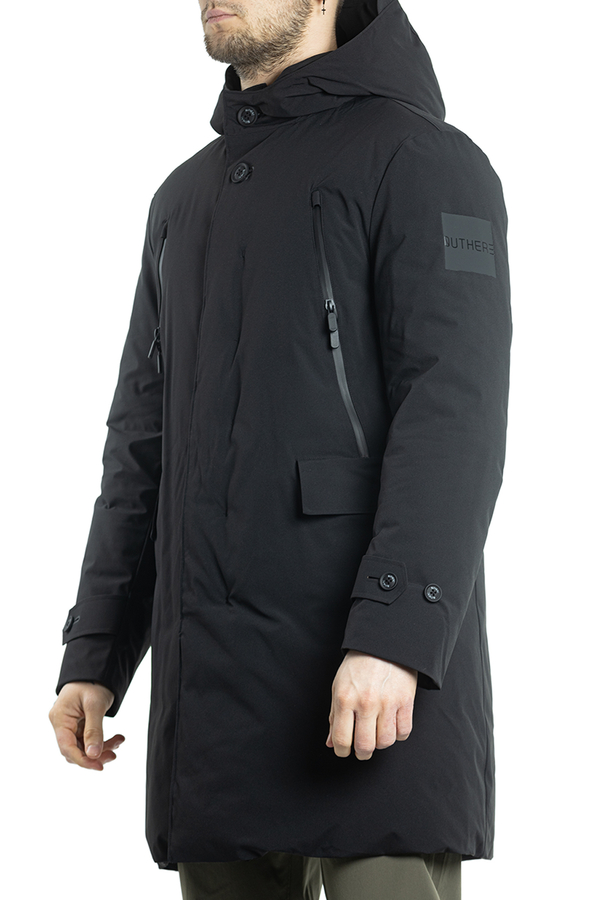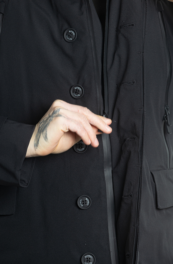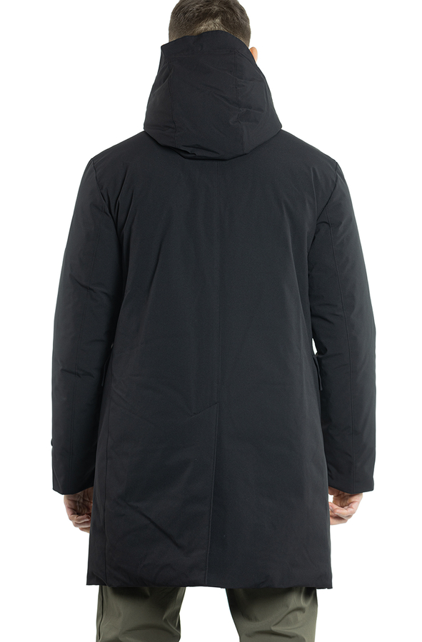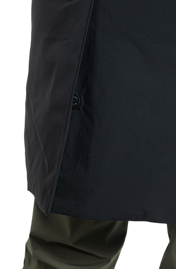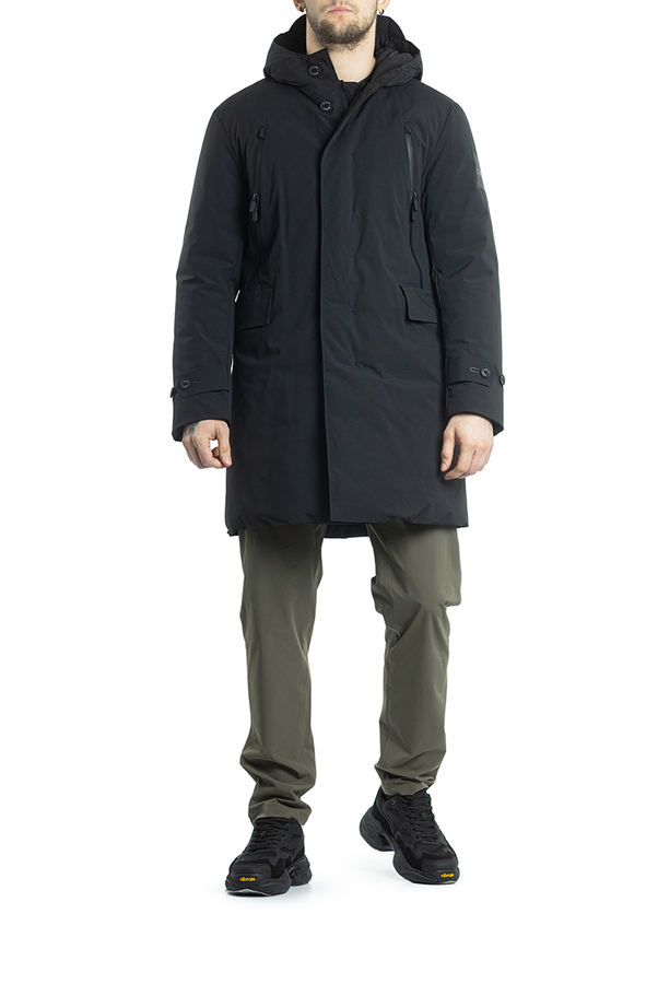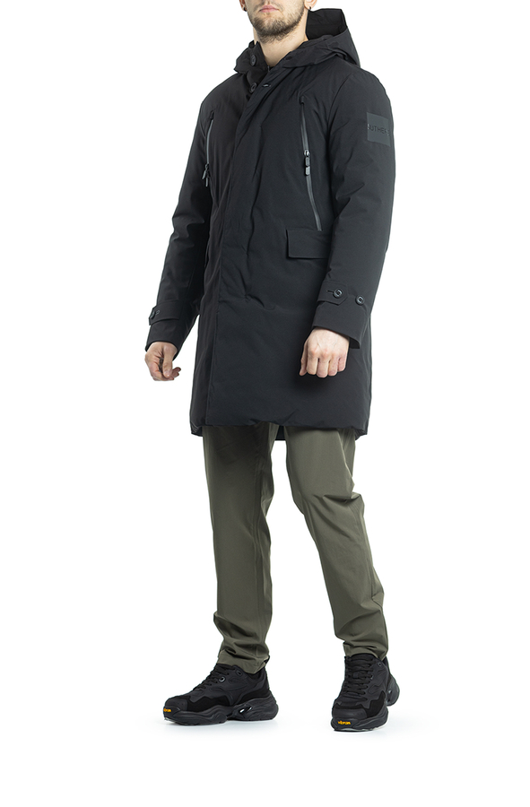 - Довга куртка з капюшоном, прихована застібка на гудзики, спереду дві прорізні кишені на подвійній блискавці та дві з клапанами, внутрішні лямки для носіння на плечах, на рукаві вставка з логотипом, ззаду шліца на гудзику