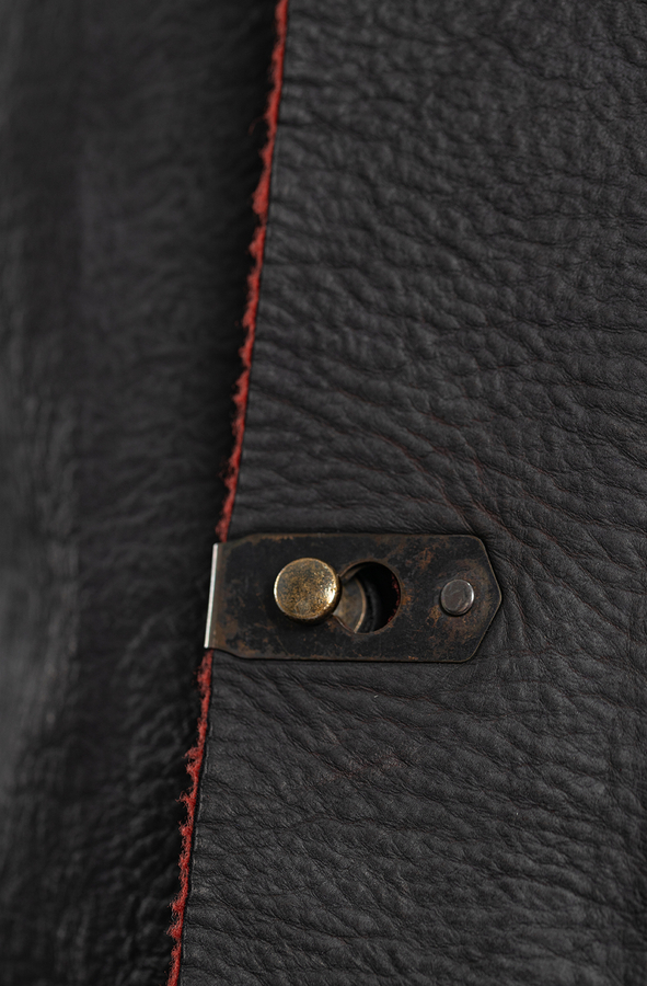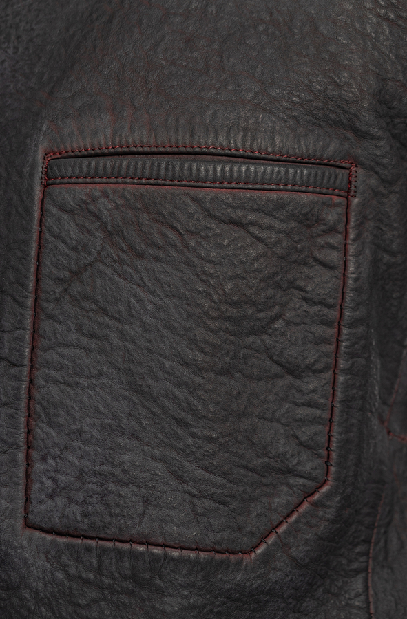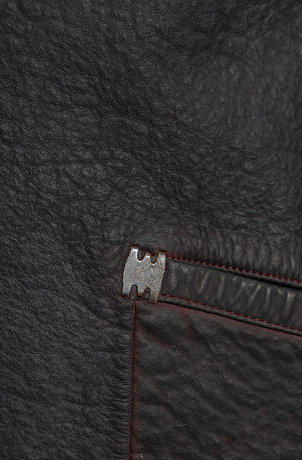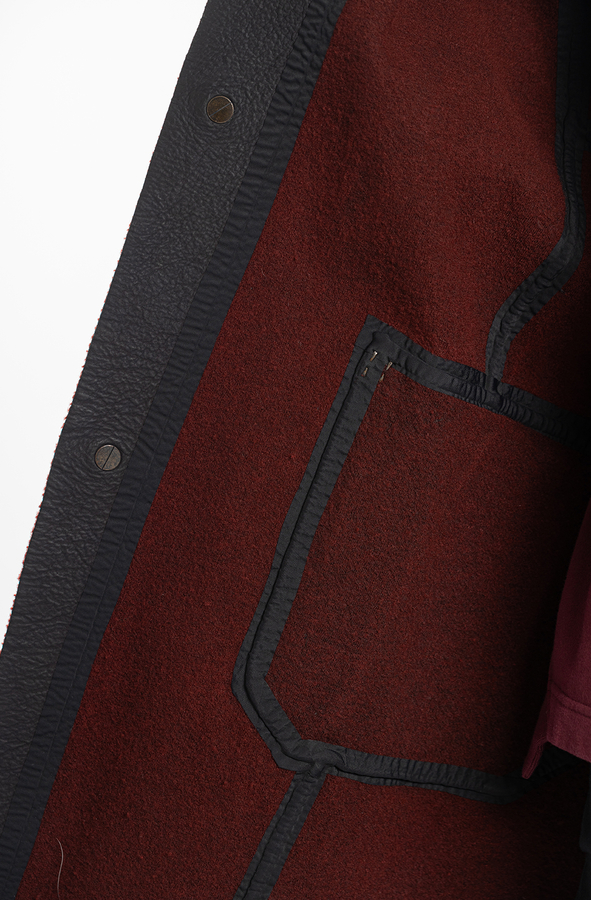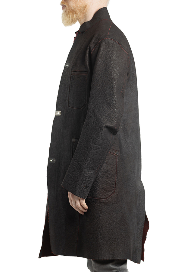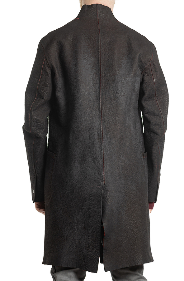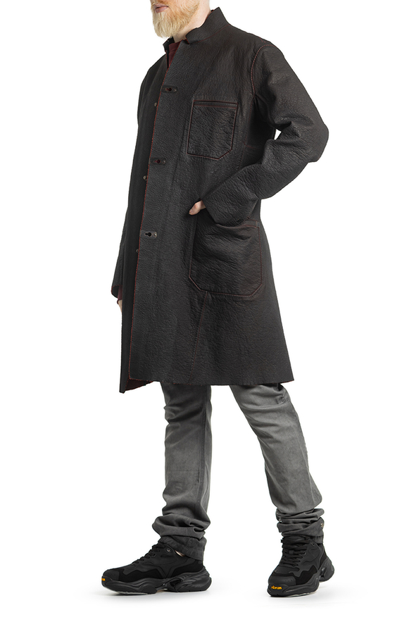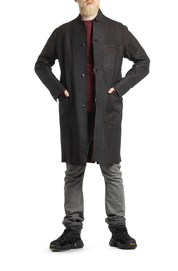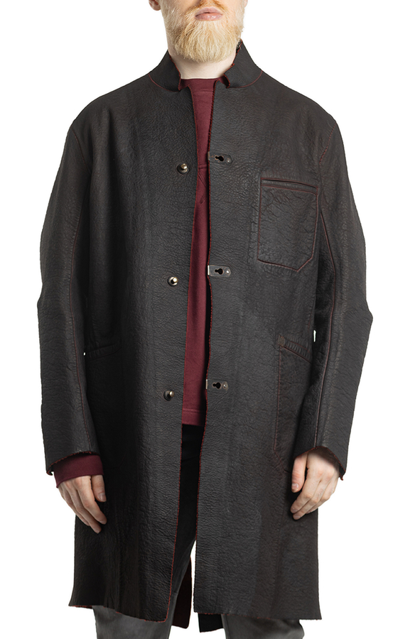 - Шкіряний плащ з контрастною внутрішньою стороною. З трьома прорізними кишенями і довгими рукавами. Великі передні кишені та нагрудна кишеня. Металеві деталі на кишенях. Застібка на гачки.