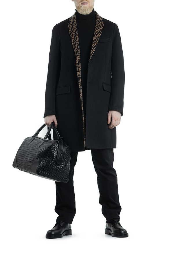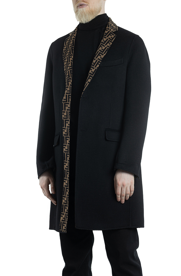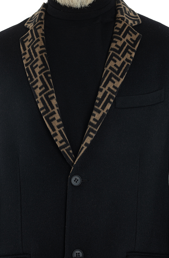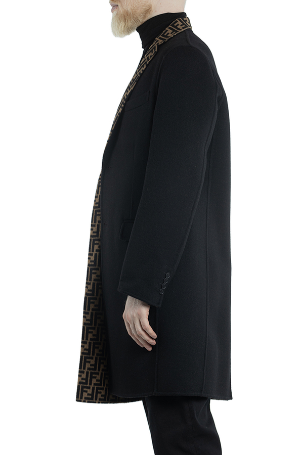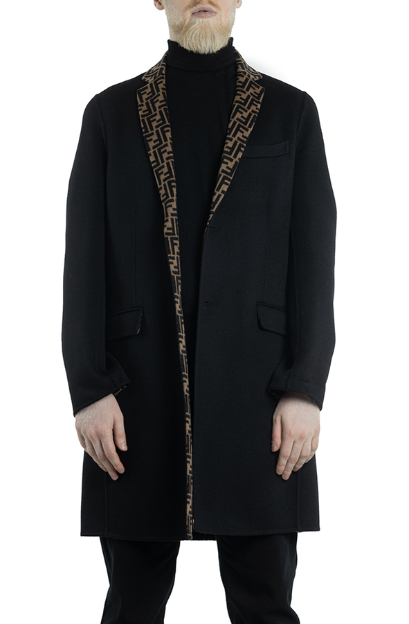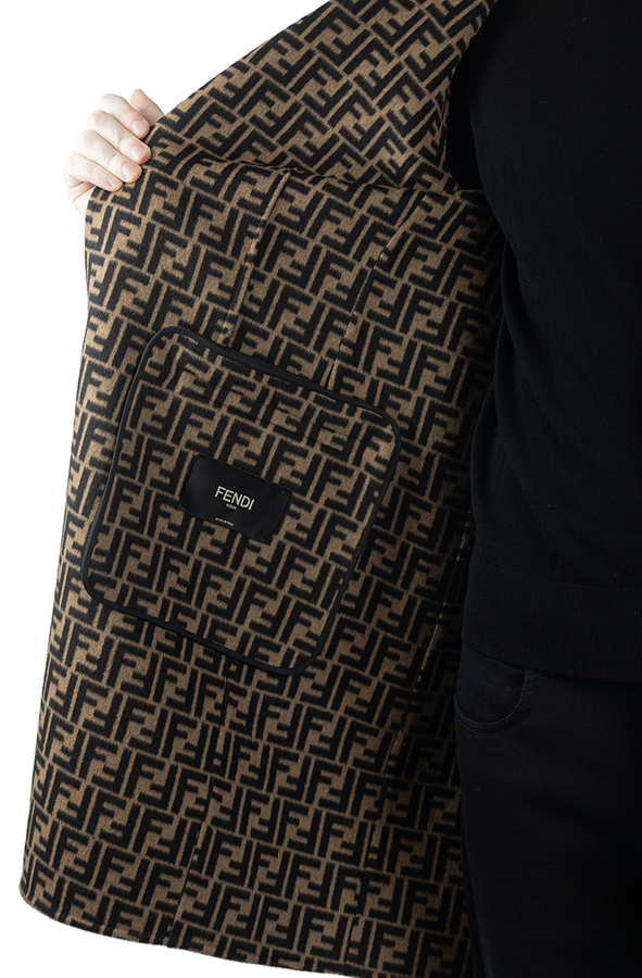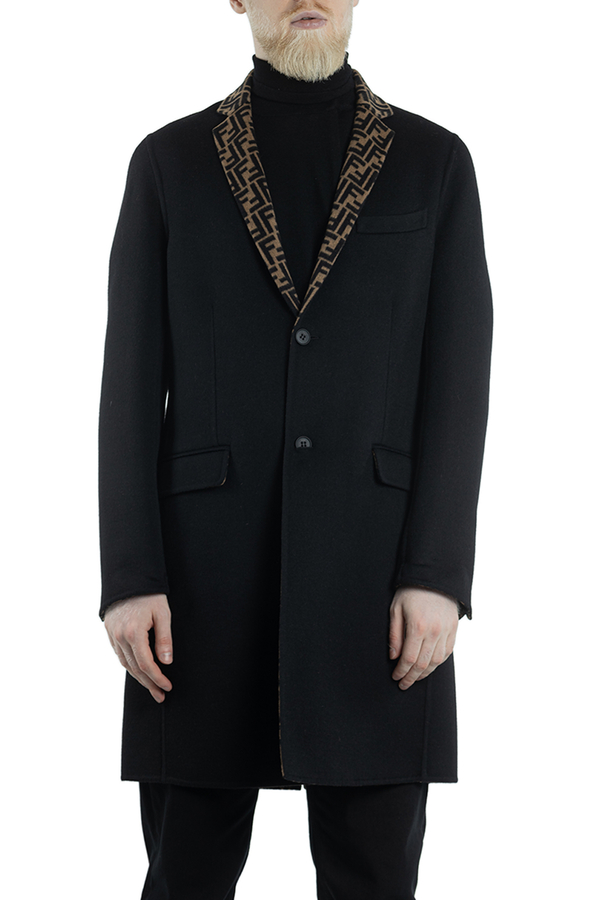 - Пальто з довгими рукавами і кишенями з клапанами. Розріз ззаду. Однобортна застібка з двома гудзиками. Модель з двошарової вовняної тканини. Внутрішня сторона з візерунком FF по всій поверхні.