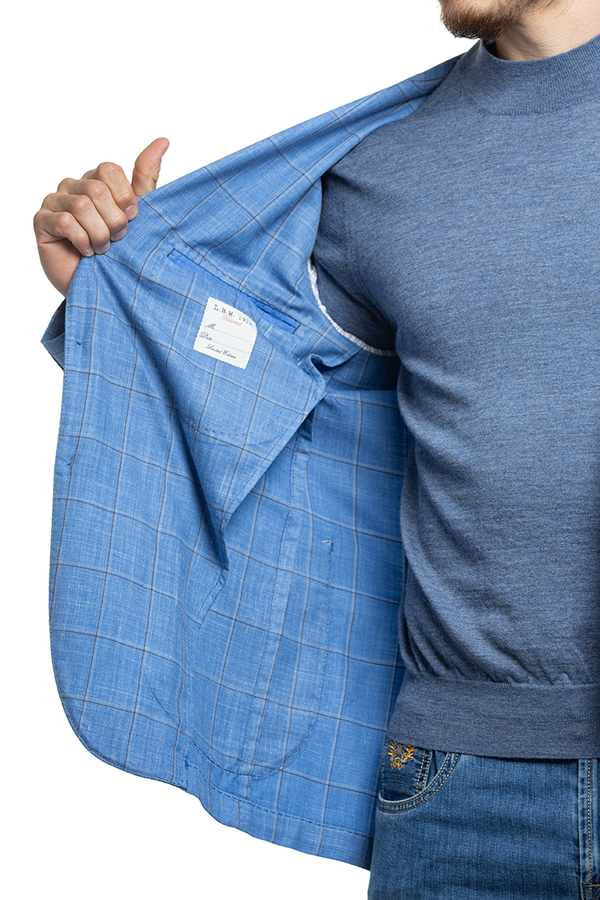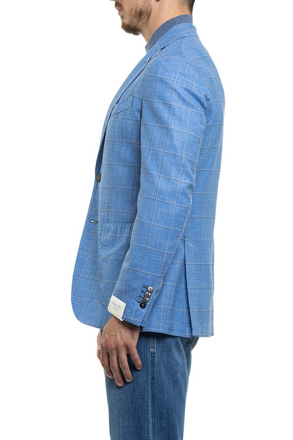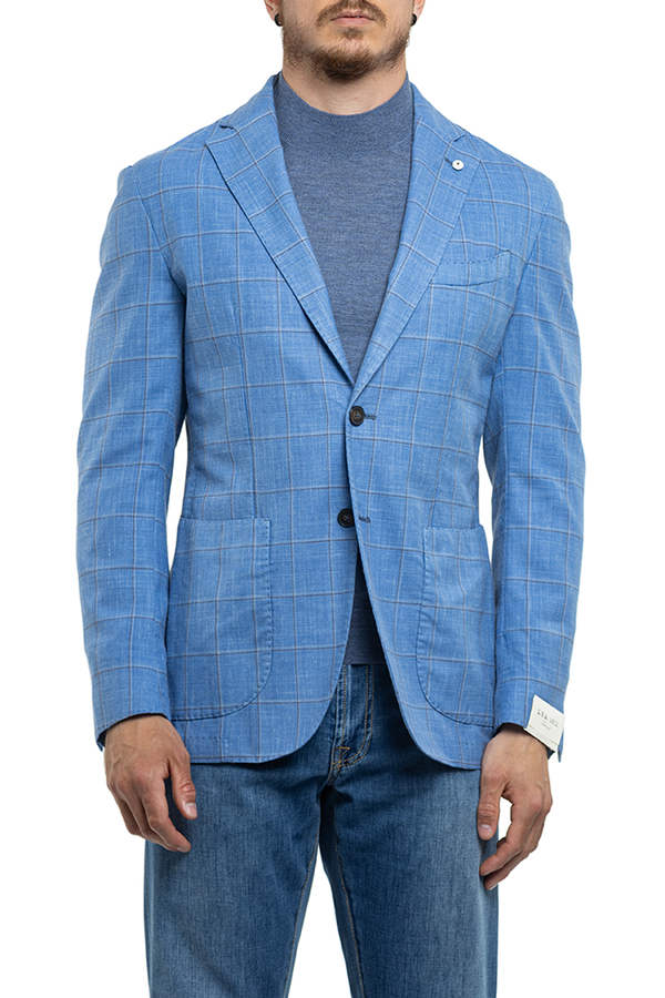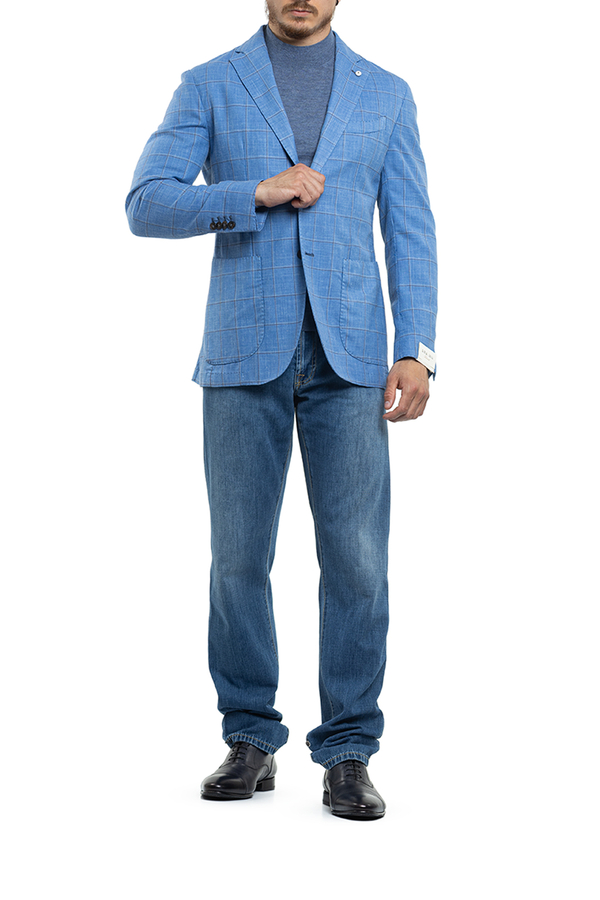 - Однобортний піджак з накладними кишенями і візерунком в клітинку.