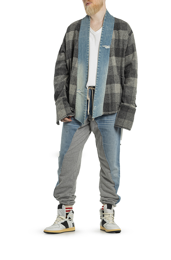 - Кардіган в клітинку з джинсовими бортами. Тканина з суміші вовни, потертий ефект, джинсова обробка, довгі рукави.