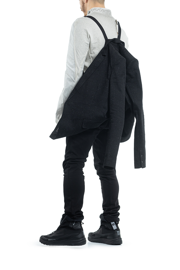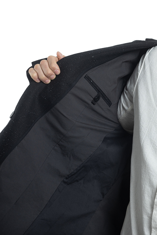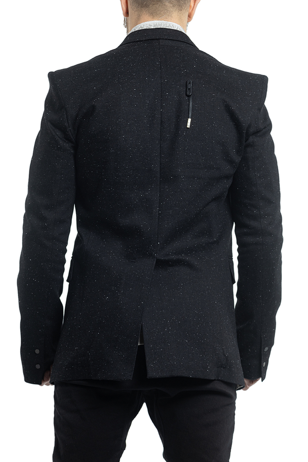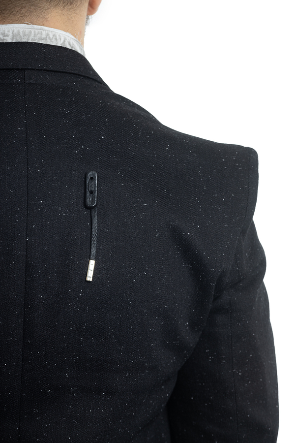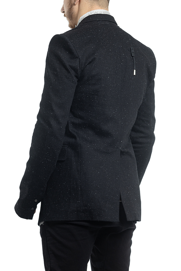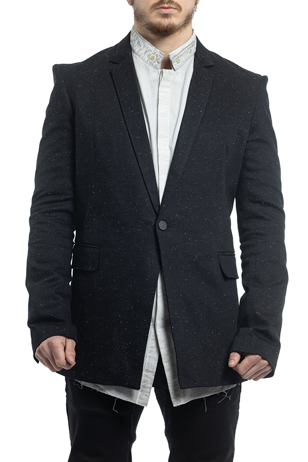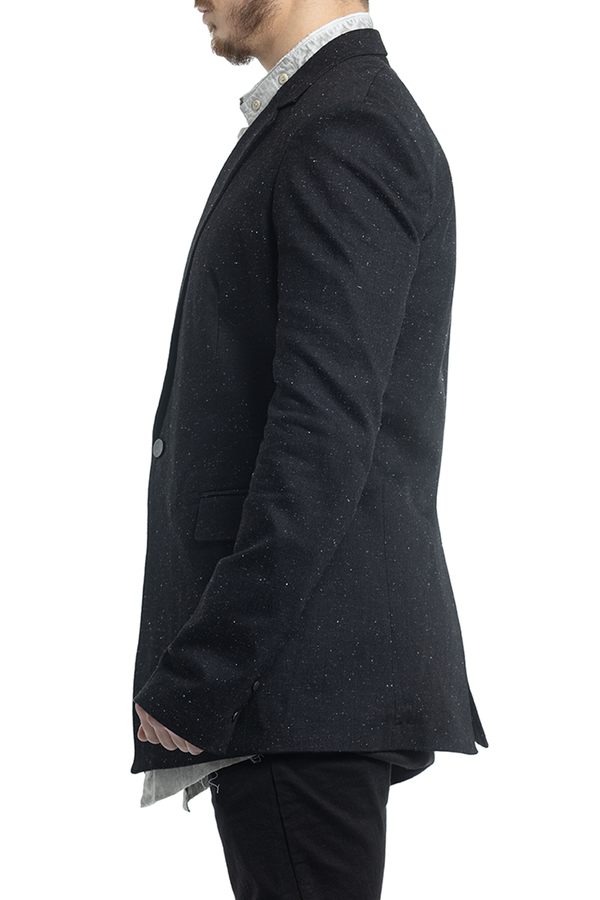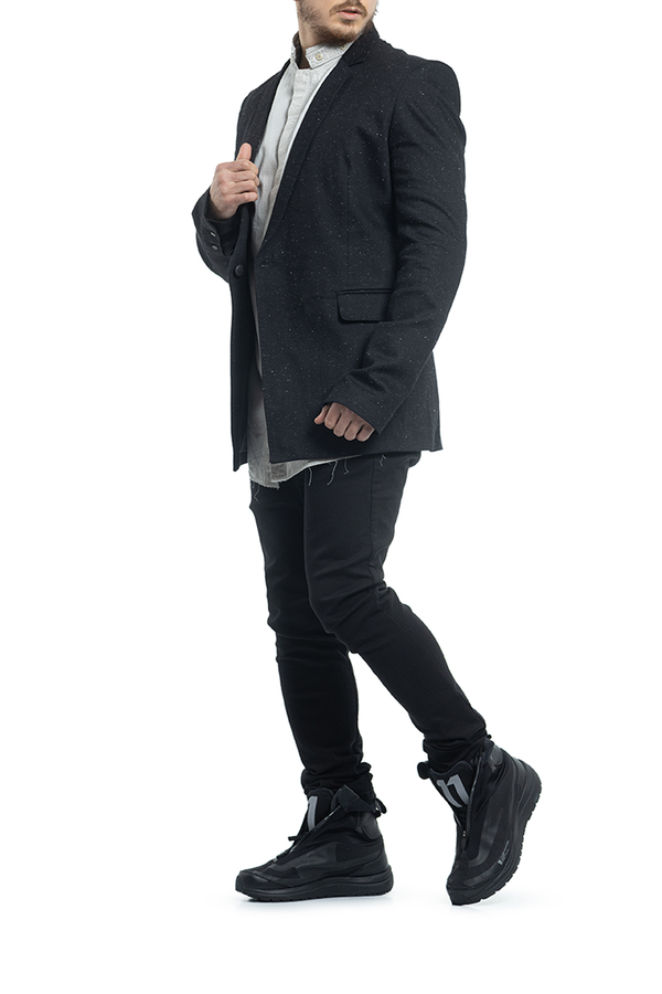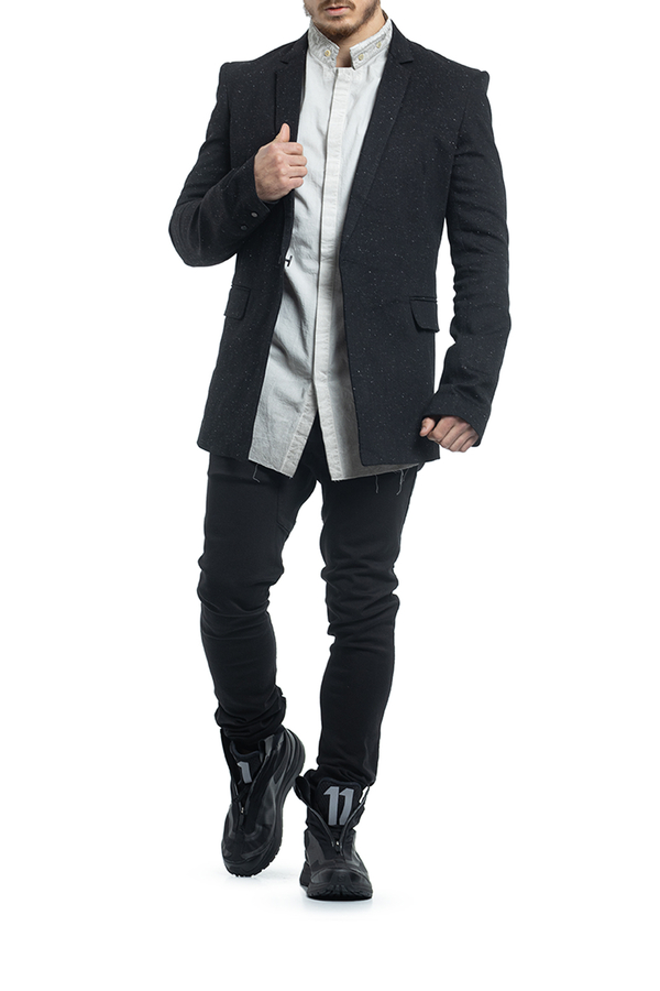 - Однобортний піджак, застібка та манжети на гудзиках, дві прорізні кишені з клапанами по боках, ззаду шліца