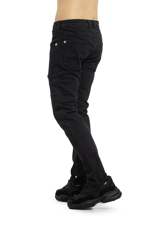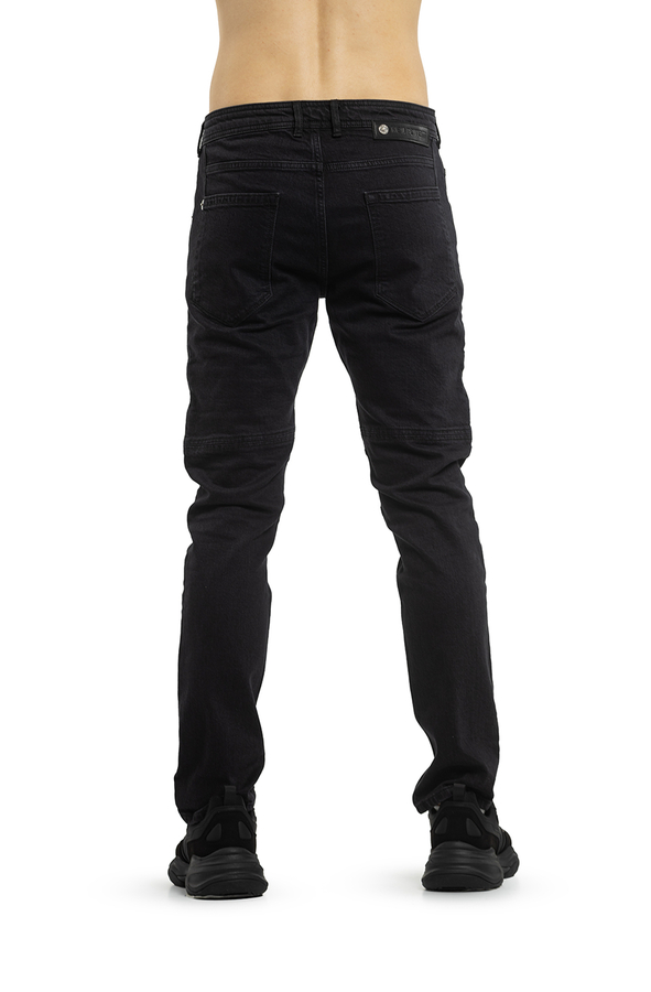 - Джинси вузького крою середньої посадки. Прикрашені блискавками і ребристим оздобленням спереду.