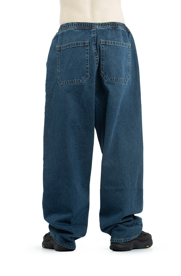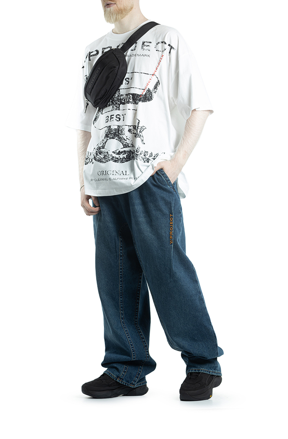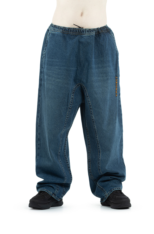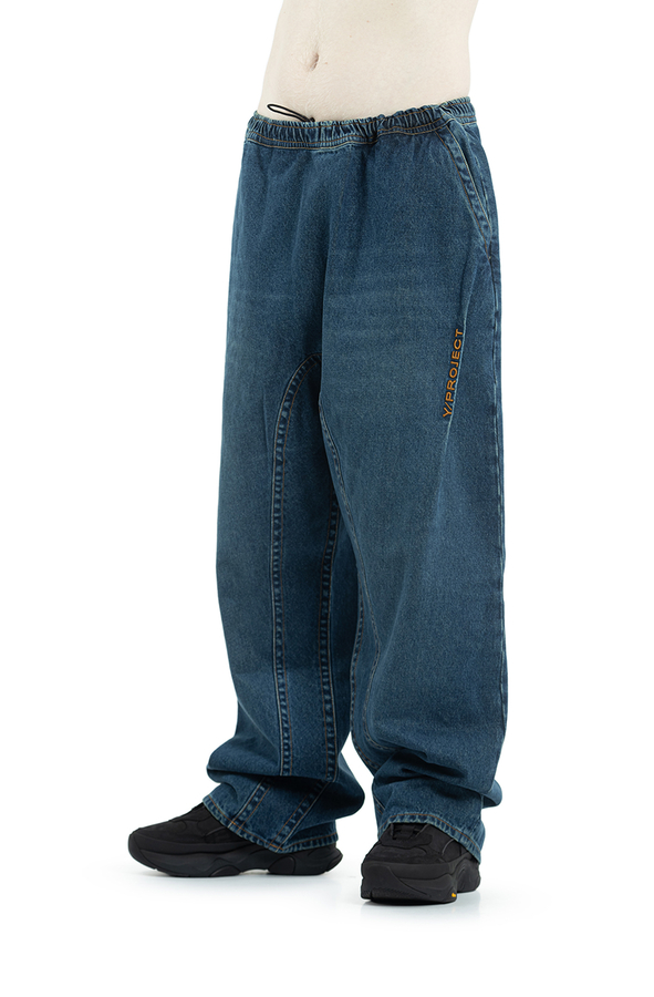 - Джинси з еластичним поясом, контрастні шви, дві прорізні кишені по боках та дві накладні ззаду, вишивка логотипу збоку