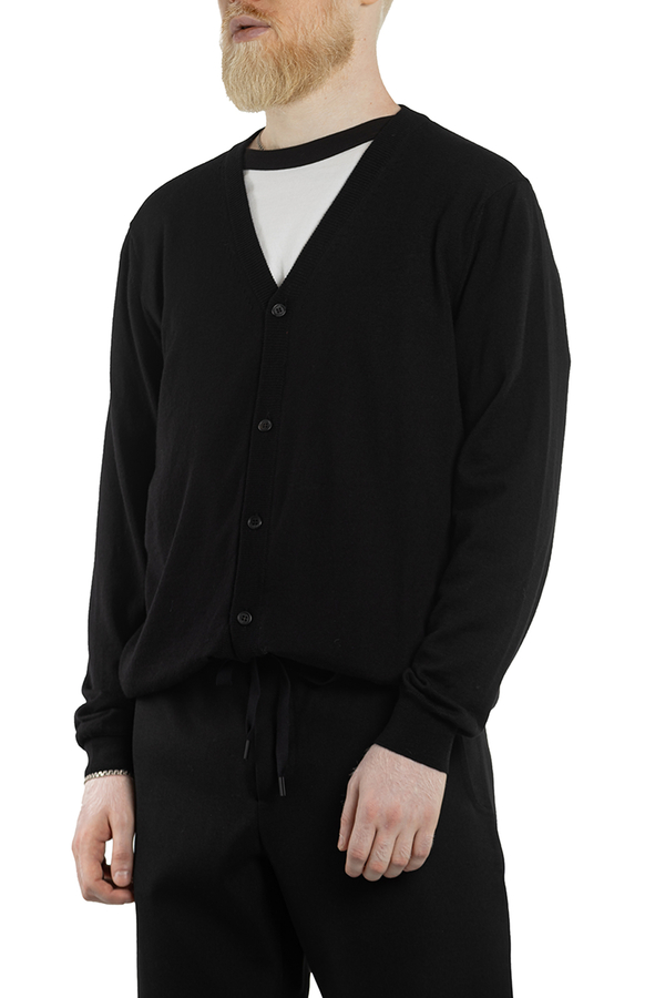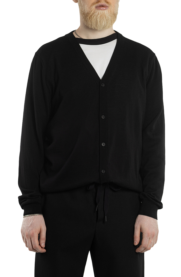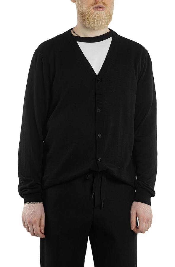- Кардиган з тонкої вовни. Довгі рукави, V-подібний виріз горловини, застібка на гудзиках.