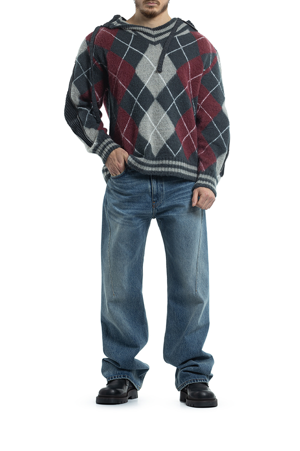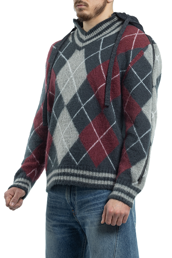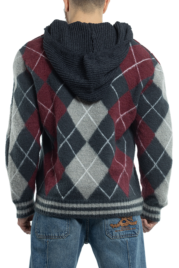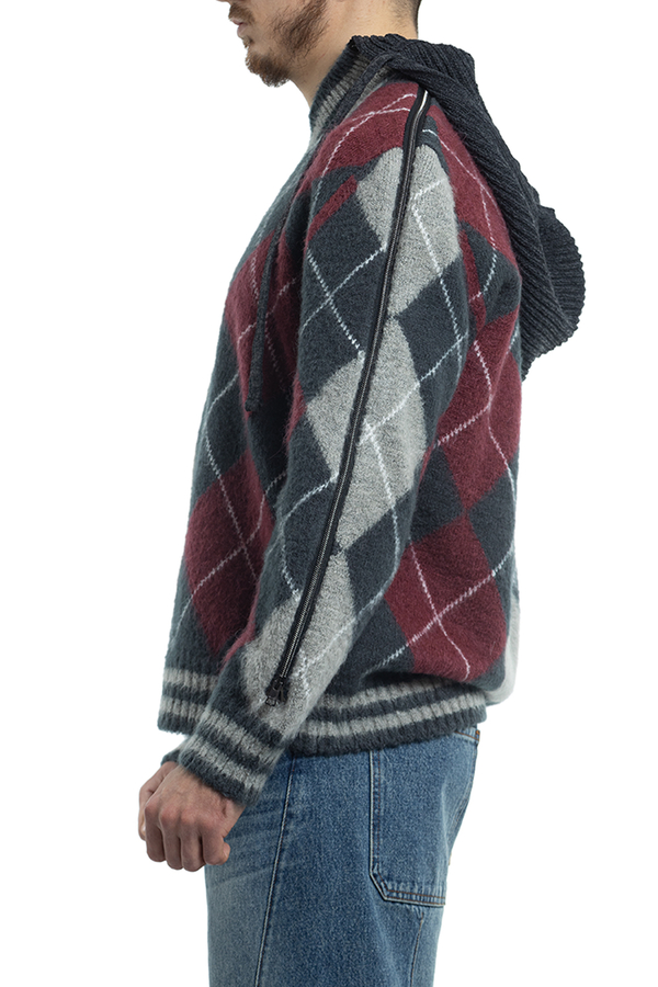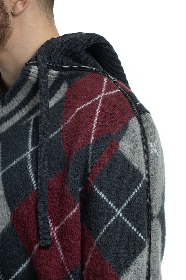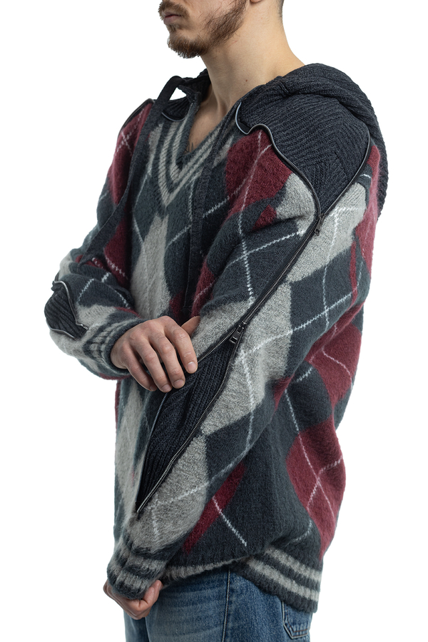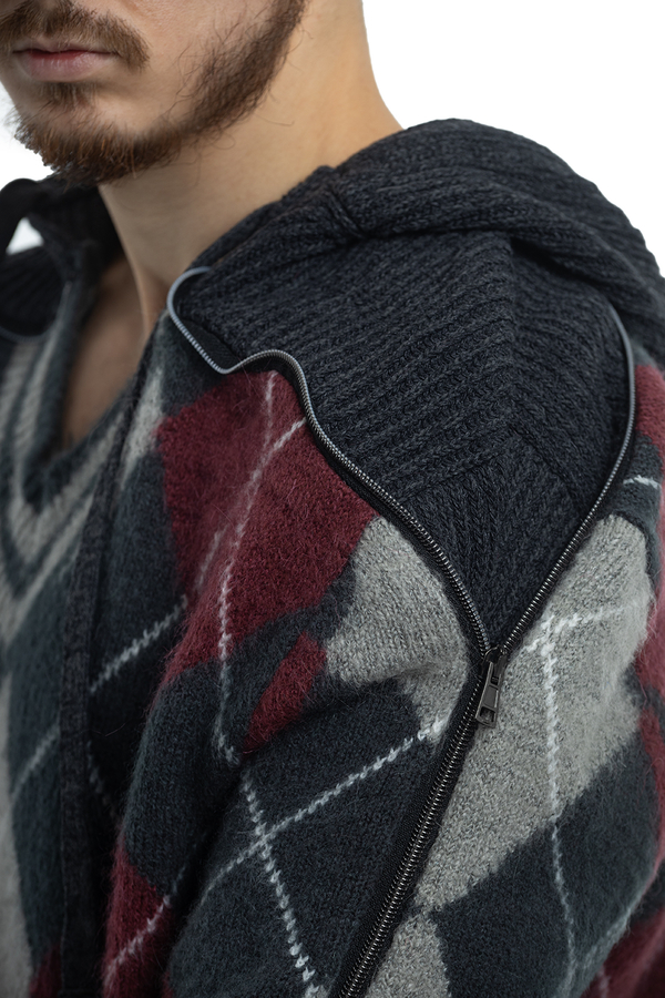 - Светр з капюшоном на шнурку, довгі рукави зі вставками-блискавками, візерунок-ромби