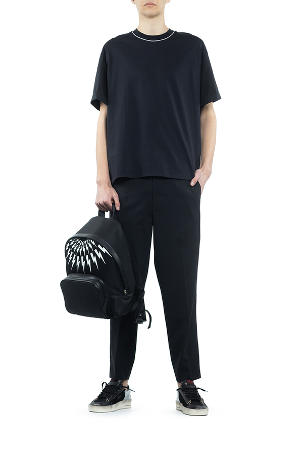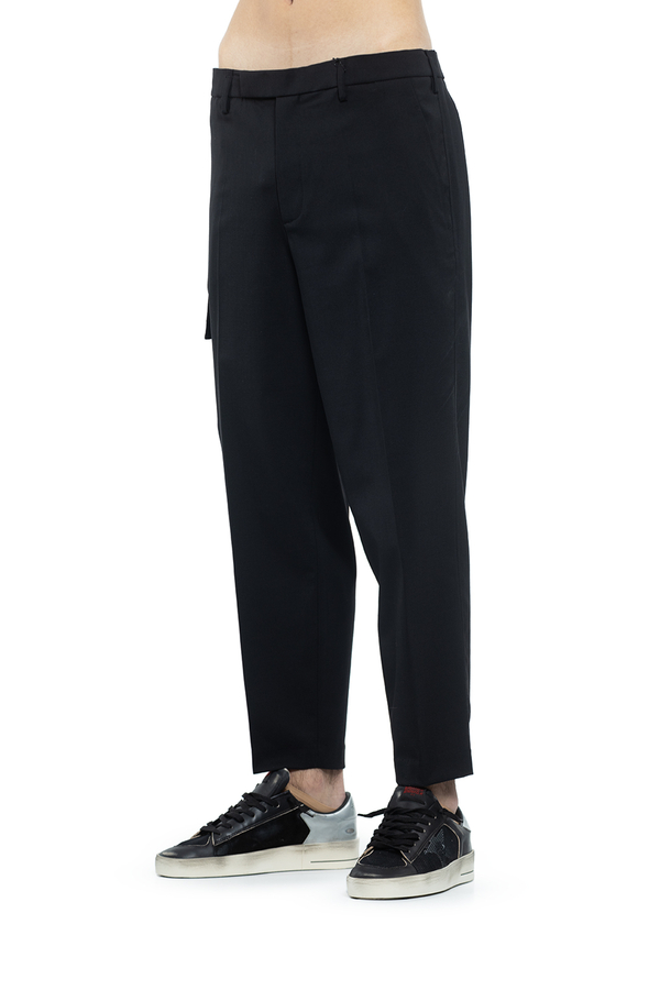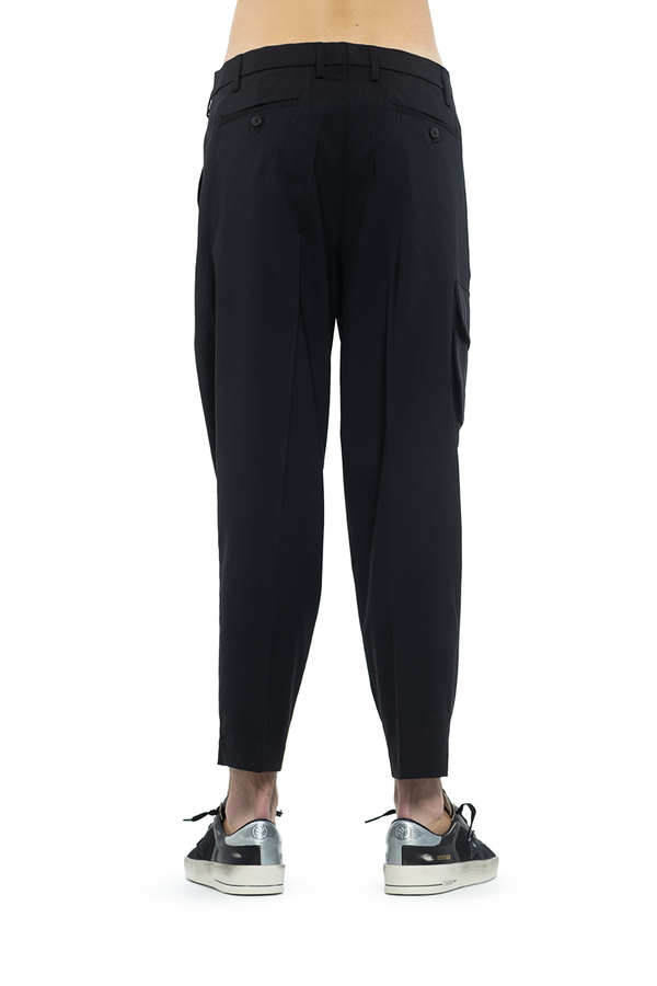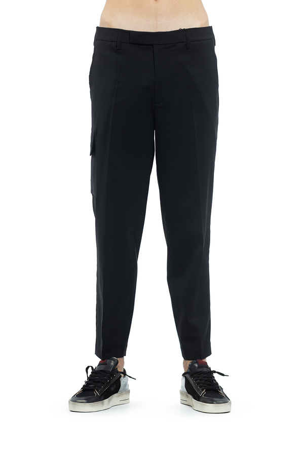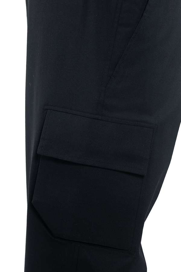 - Звужені штани-карго, шльовки для ременя, дві діагональні кишені з боків, бічна кишеня-карго, дві задні кишені на гудзиках, потайна застібка на гудзик, гачок та блискавку