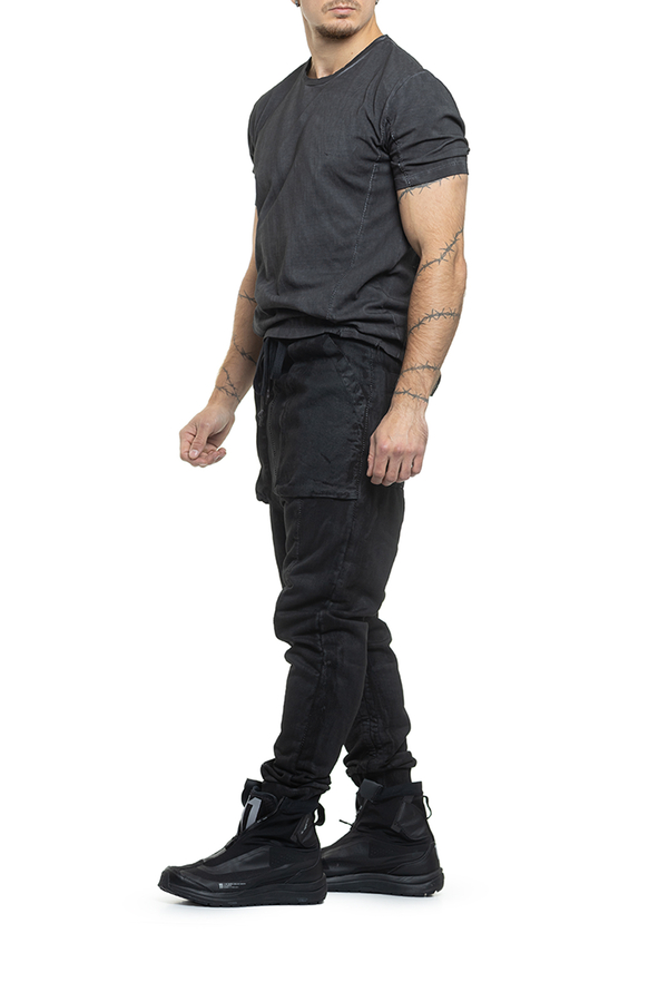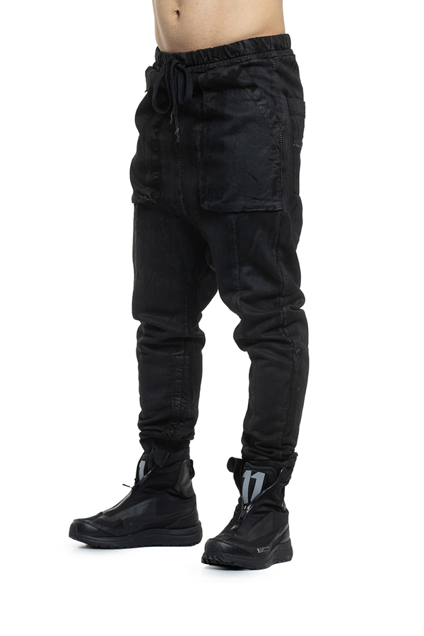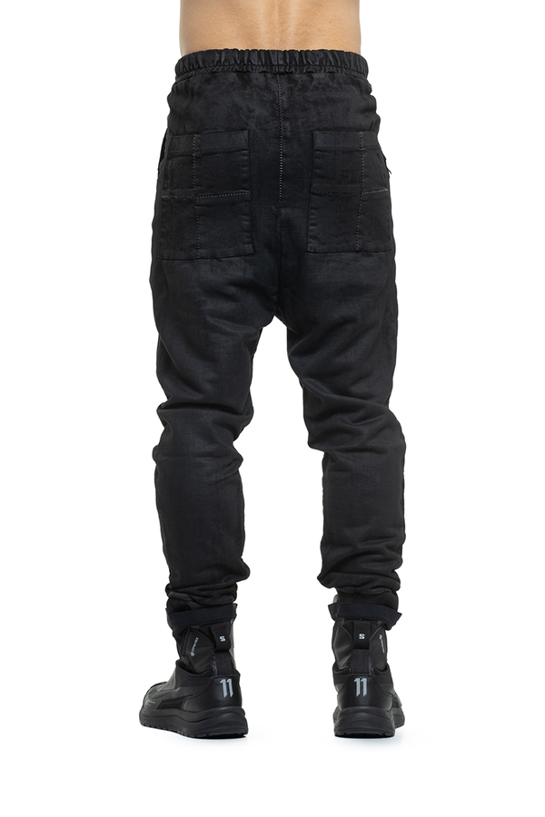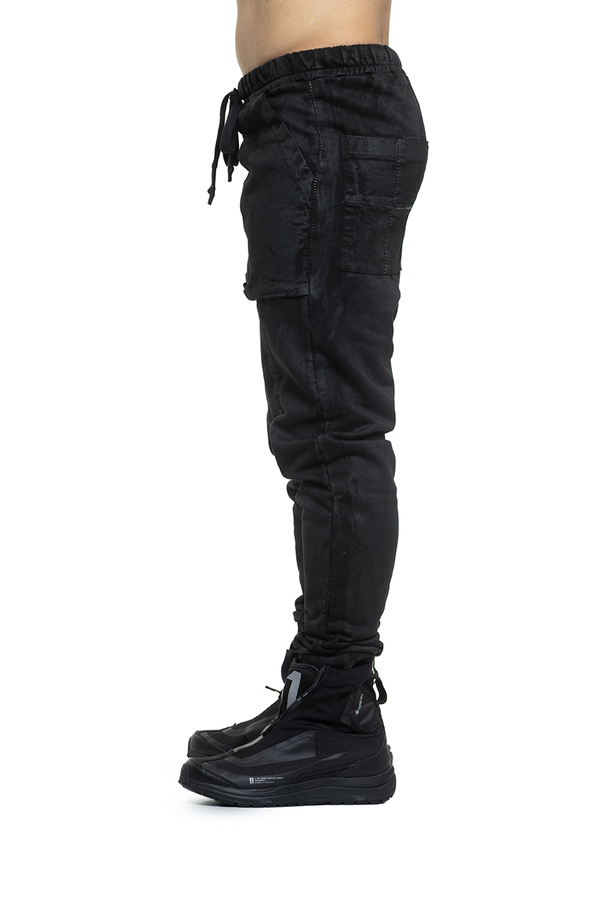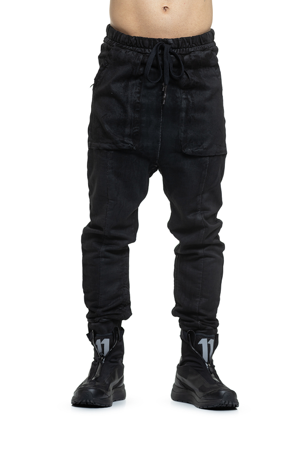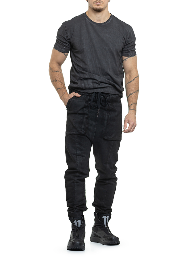 - Штани з покриттям під шкіру та фірмовим заниженим кроковим швом, легка потертість, еластичний пояс із подовженими шнурками, тональні шви,звуження до манжетів, великі накладні кишені спереду та ззаду