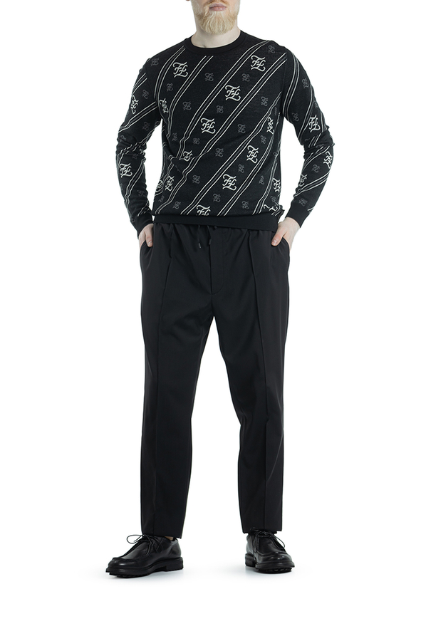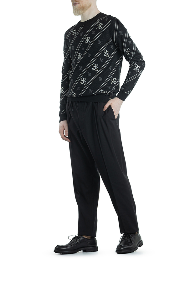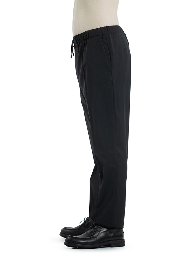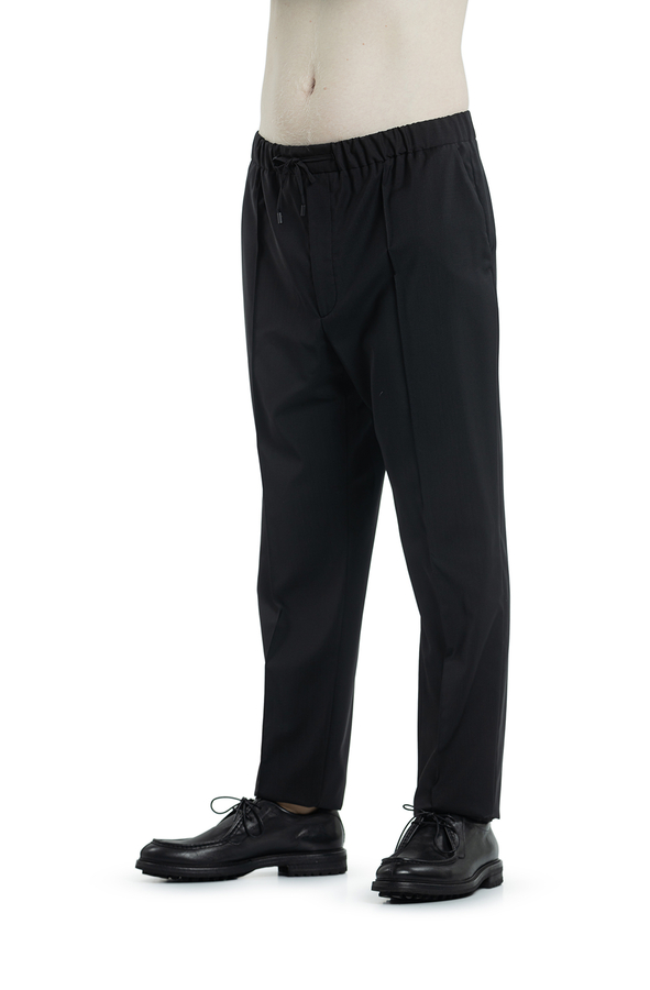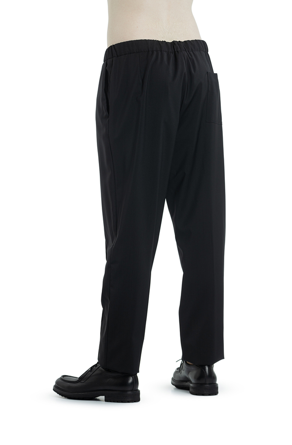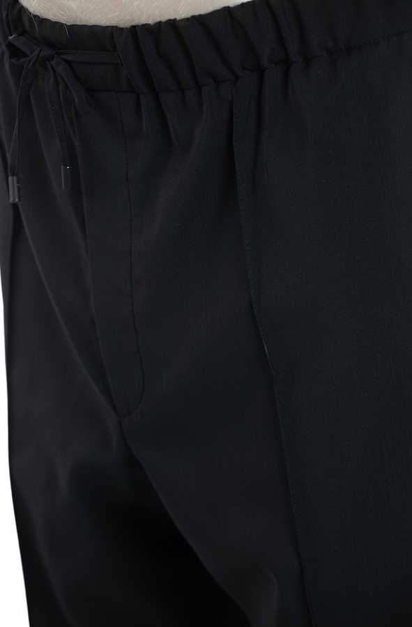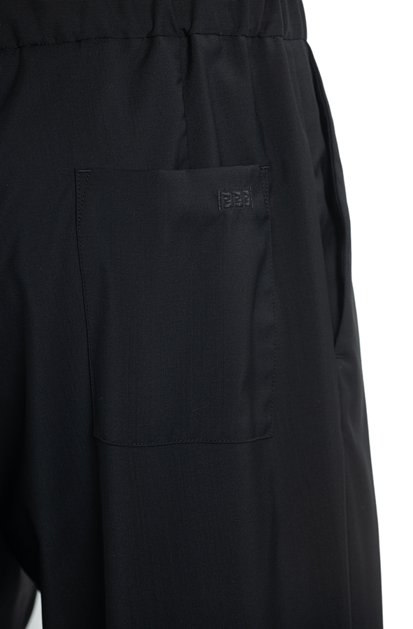 - Штани прямого крою з вовни. На еластичному поясі з куліскою, з наведеними стрілками і накладною кишенею позаду.