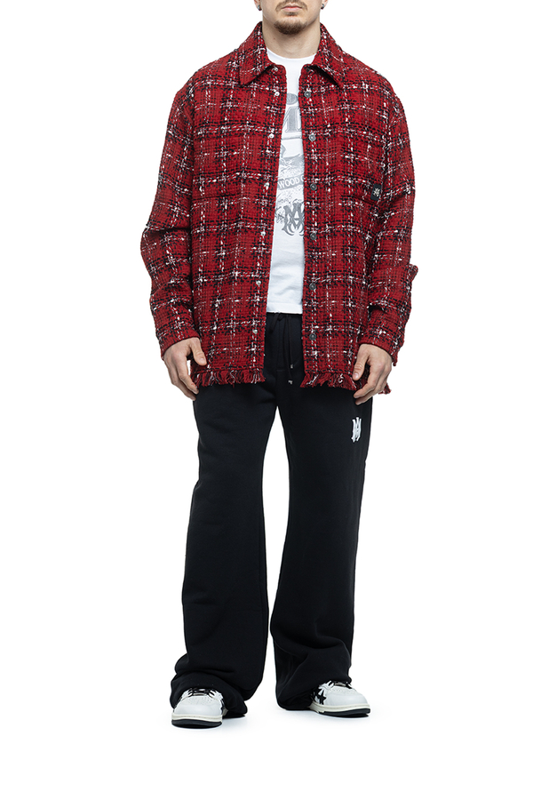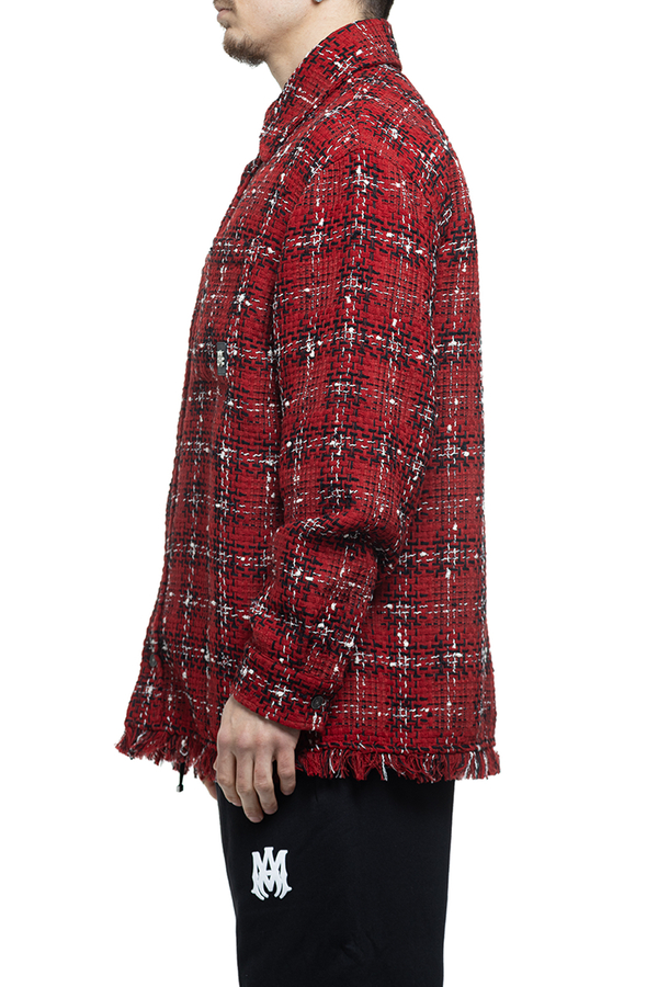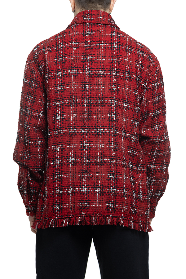 - Клітчаста сорочка з довгими рукавами, класичний комір, бахрома по нижньому краю, застібка на кнопки, нашивка з монограмою на грудях