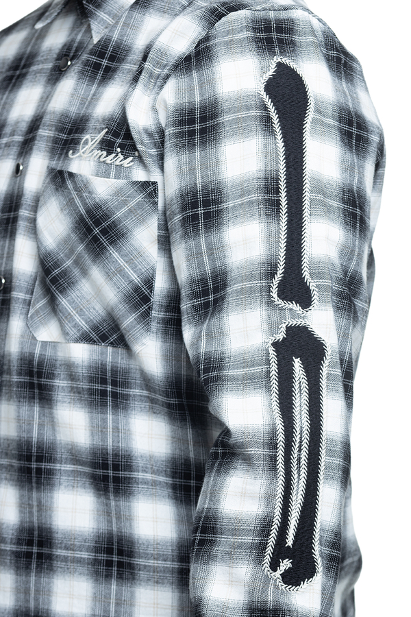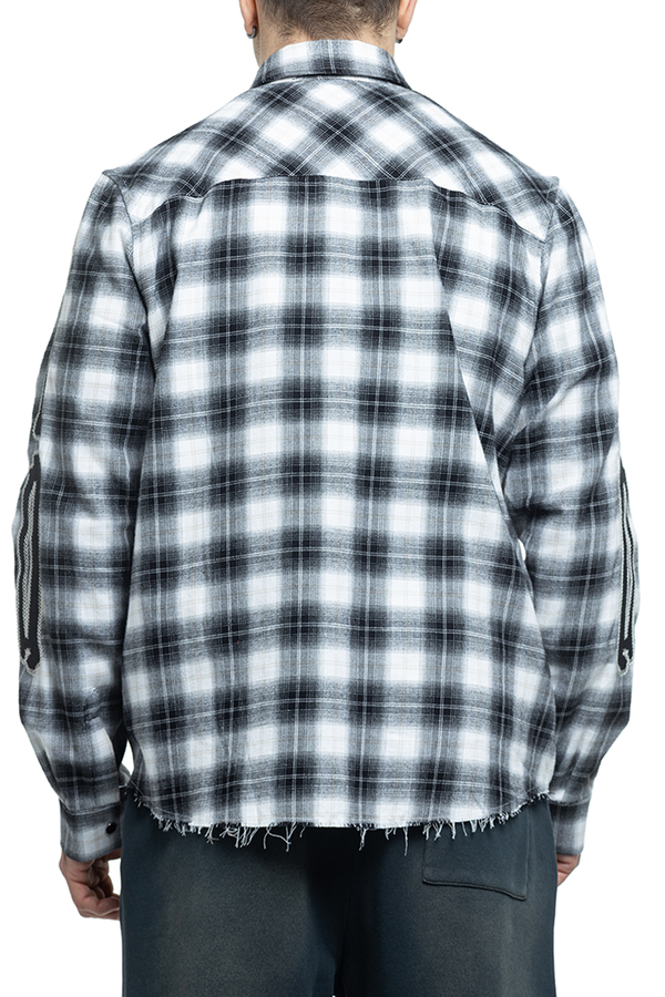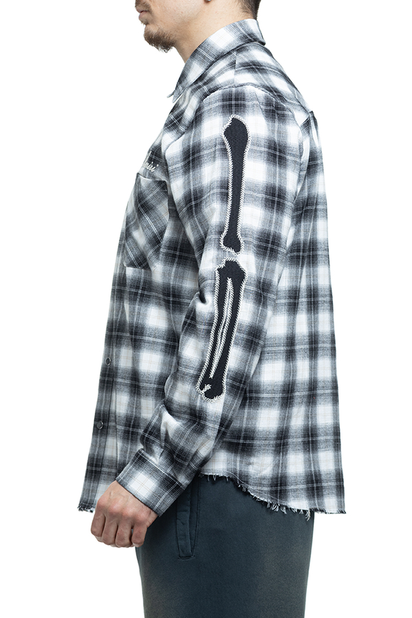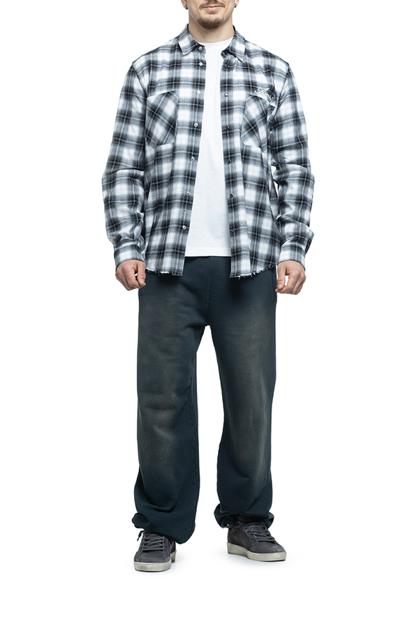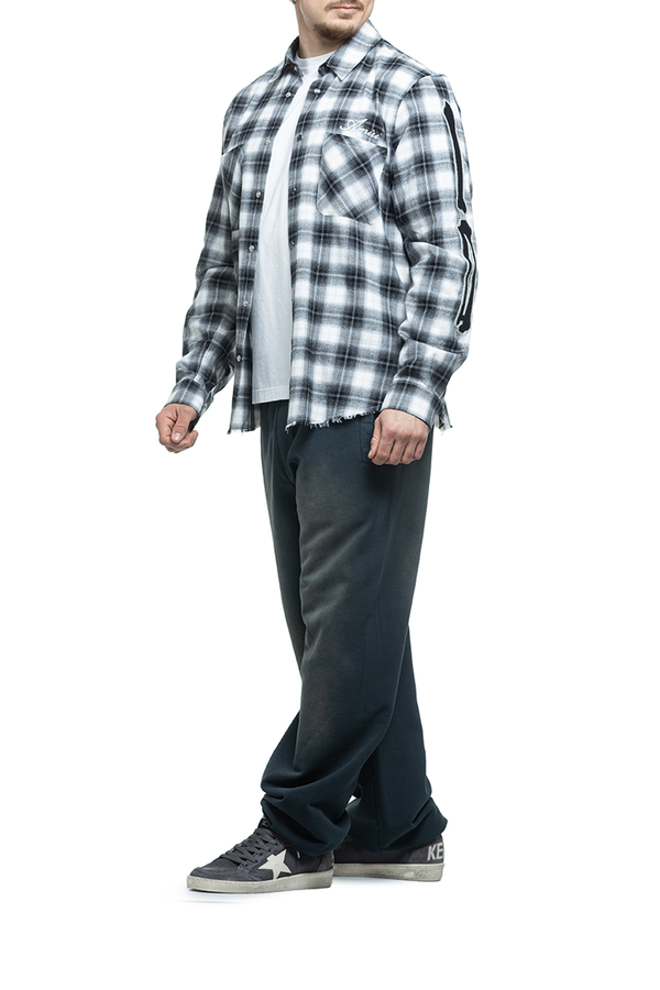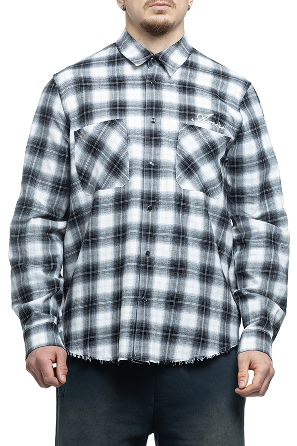 - Клітчаста сорочка з довгими рукавами, класичний комір, фігурний необроблений низ, аплікація на рукавах, манжети та застібка на гудзики, дві нагрудні накладні кишені, вишивка логотипа