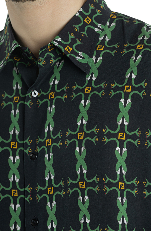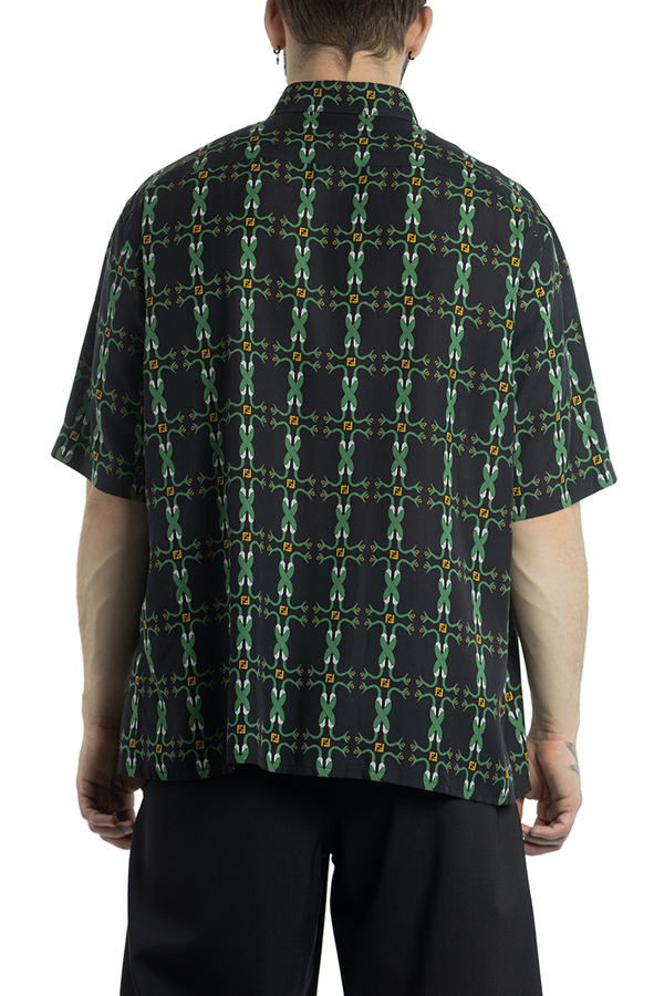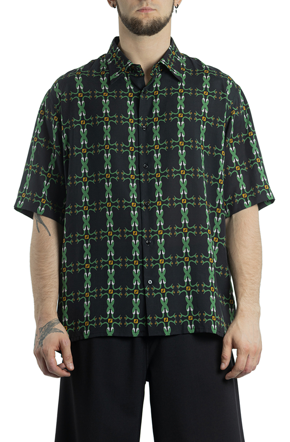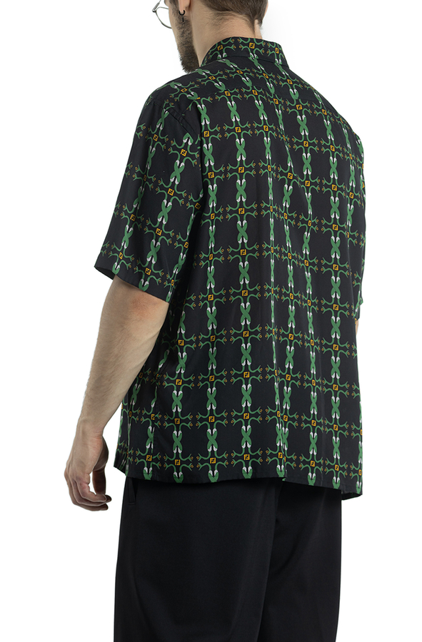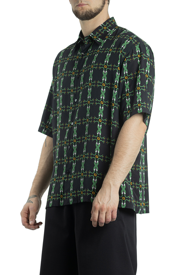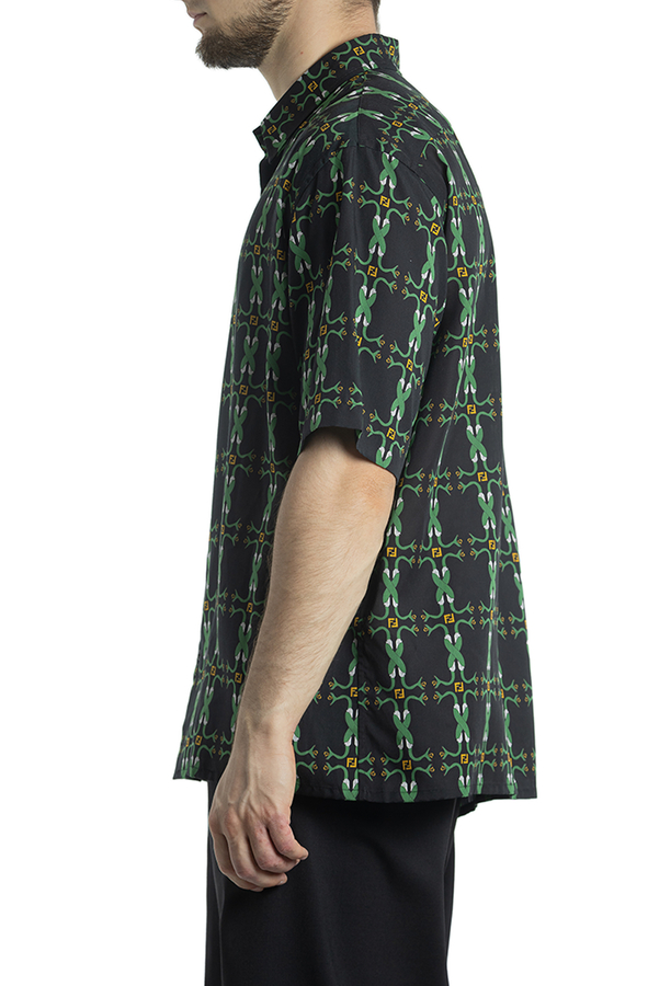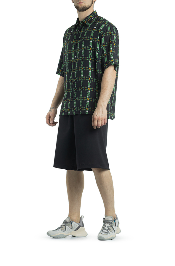 - Сорочка з короткими рукавами. З візерунком зеленої змії, з класичним коміром, застібкою на гудзиках спереду та прямим подолом.