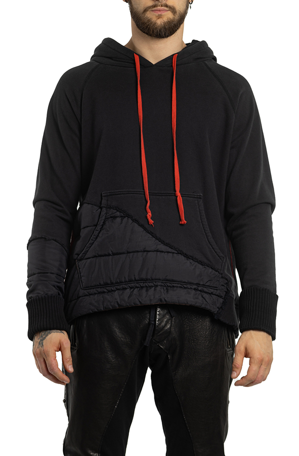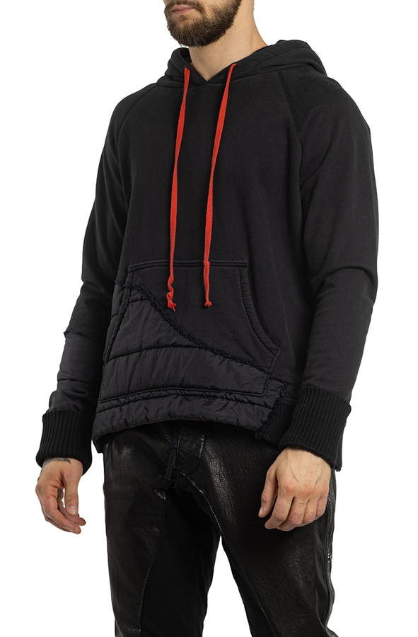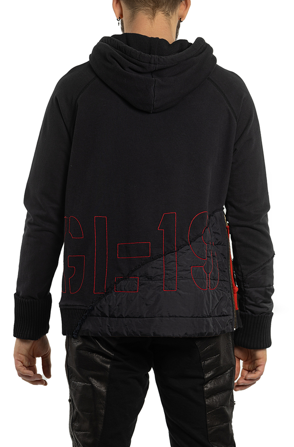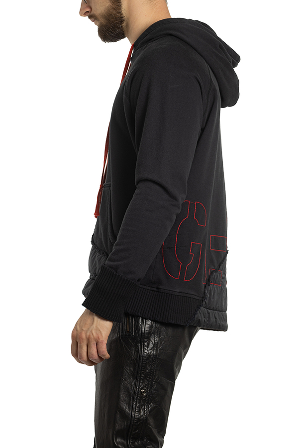 - Худі з капюшоном і червоною вишивкою на спині. Червоний шнурок в капюшоні, кишеня -кенгуру спереду, еластичні манжети на рукавах. Вставки з нейлону.