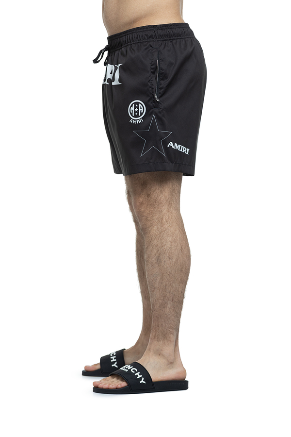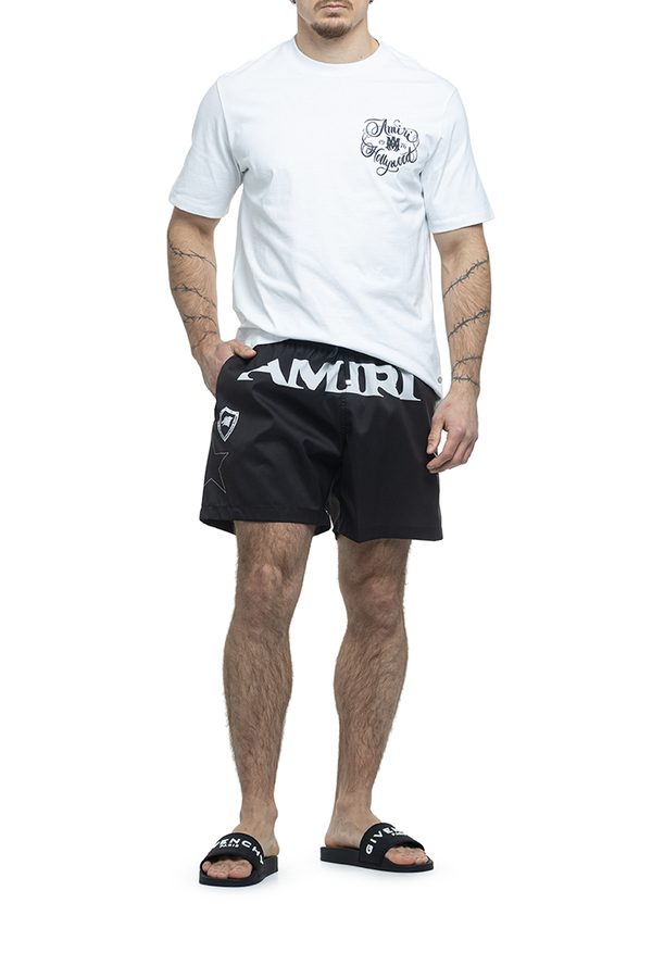- Плавки з еластичним поясом на шнурку, принт логотипу, дві кишені на блискавках у бічних швах, одна накладна кишеня ззаду