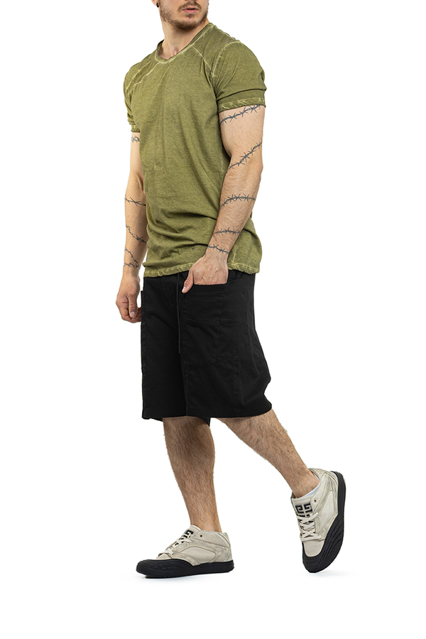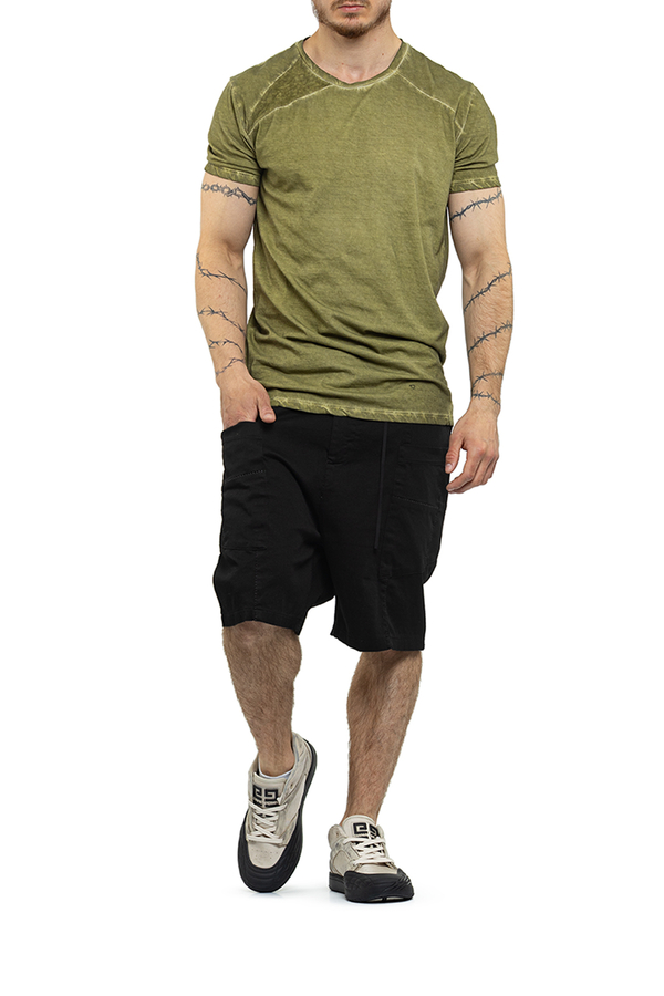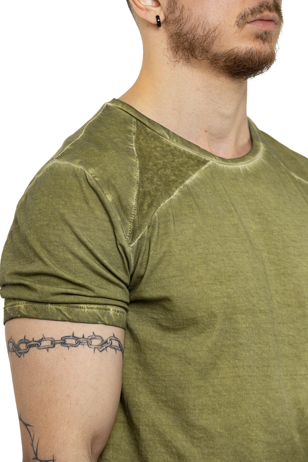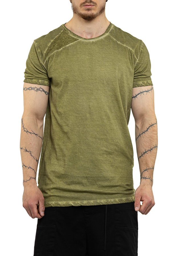 - Футболка з короткими рукавами, круглий виріз горловини, ефект потертості на швах