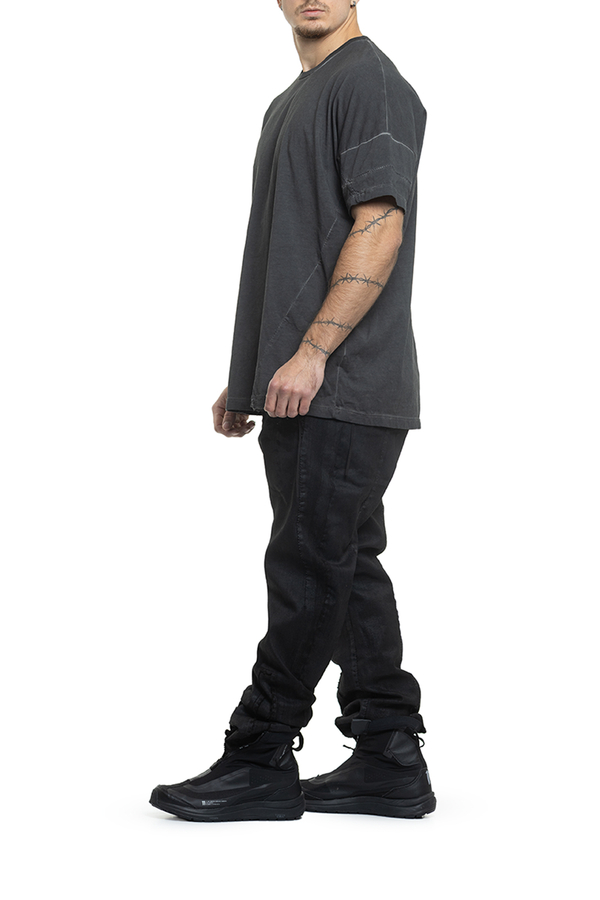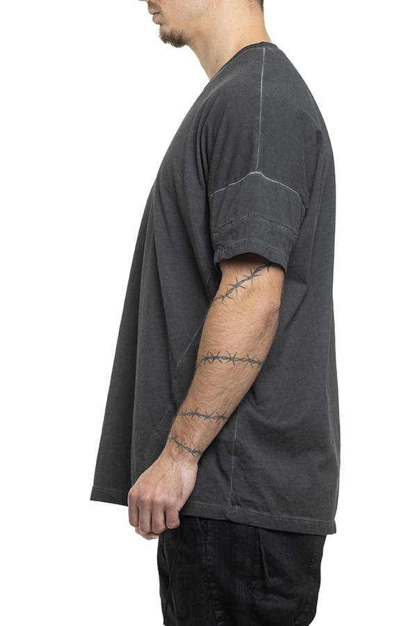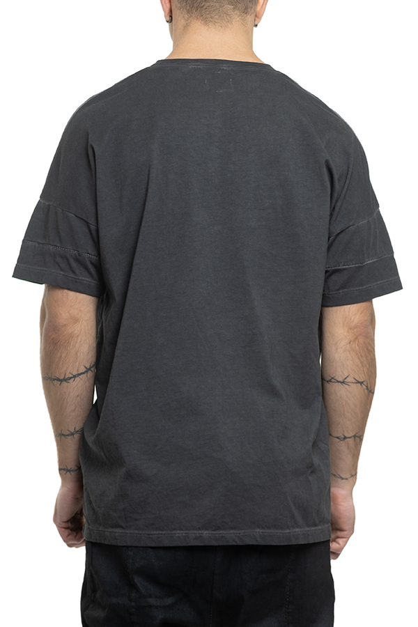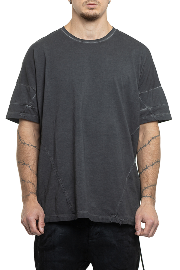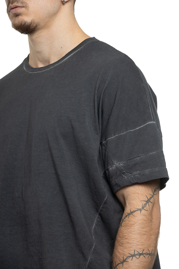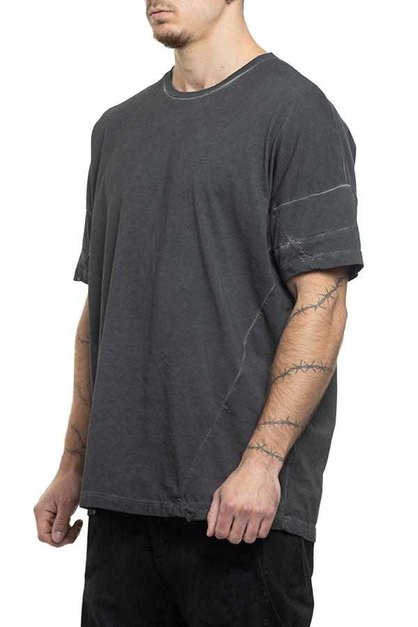 - Футболка вільного крою, короткі рукави, круглий виріз горловини, шви з ефектом потертості