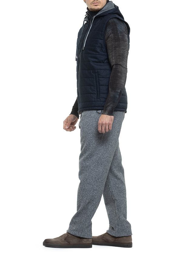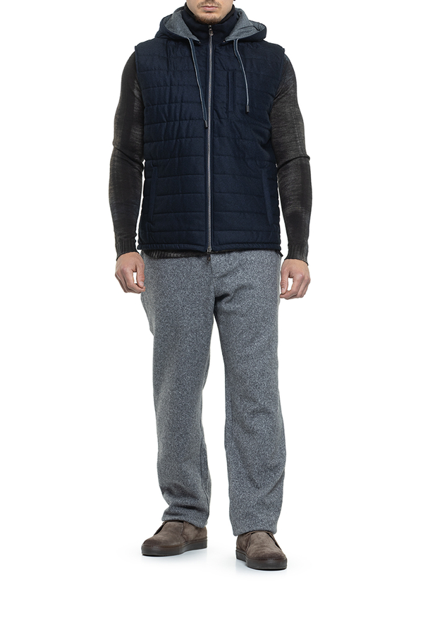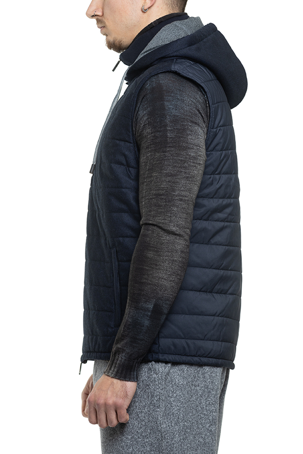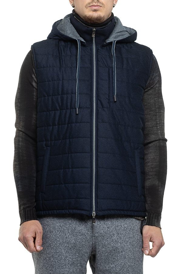 - Прострочений жилет із високим коміром та капюшоном, спереду застібка на подвійну блискавку, підкладка, одна нагрудна та дві бокові прорізні кишені