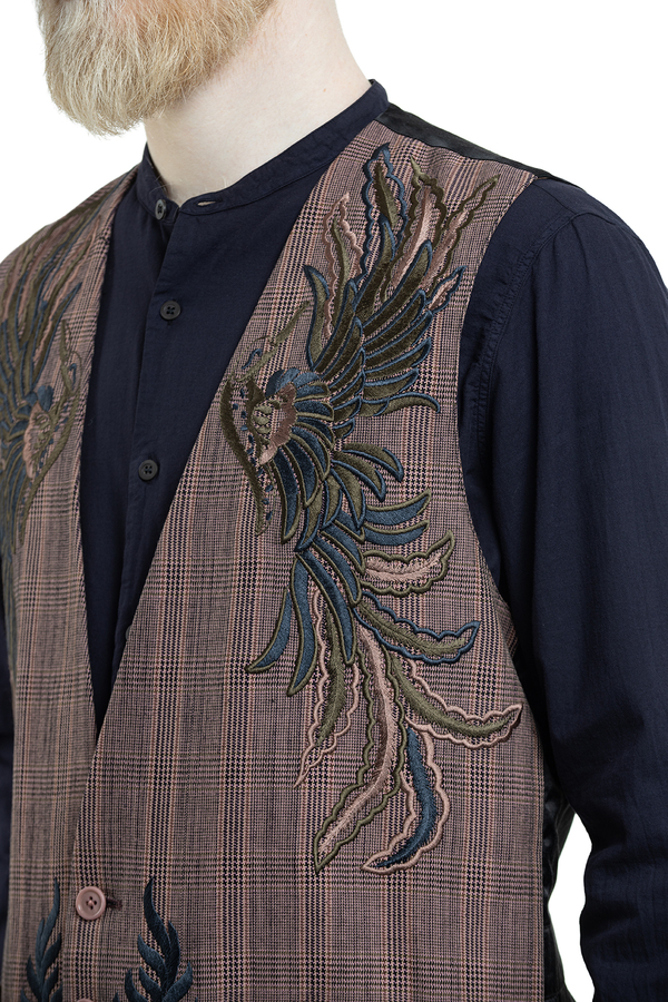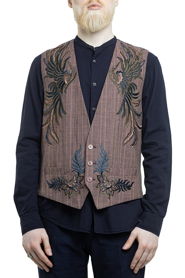 - Жилет з принтом ламаної клітинки і з кольоровою вишивкою.