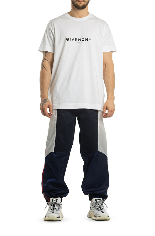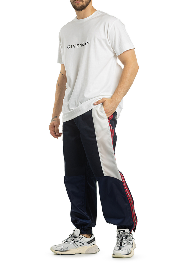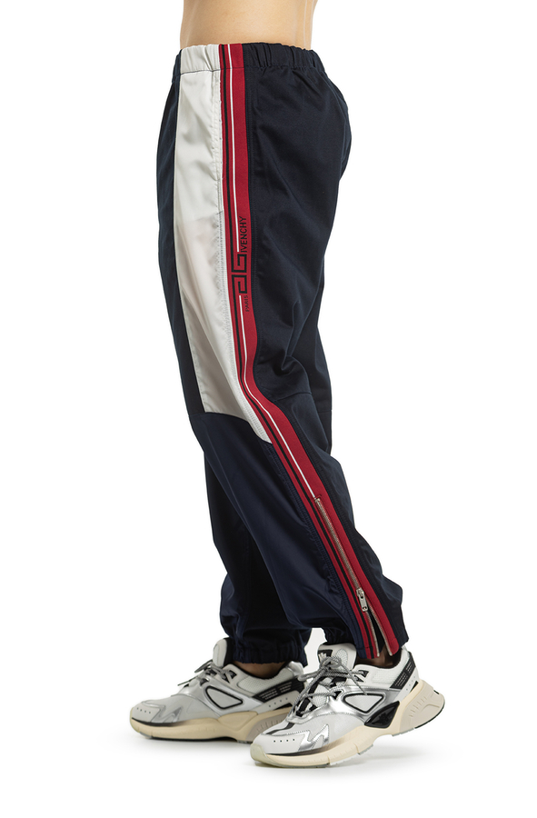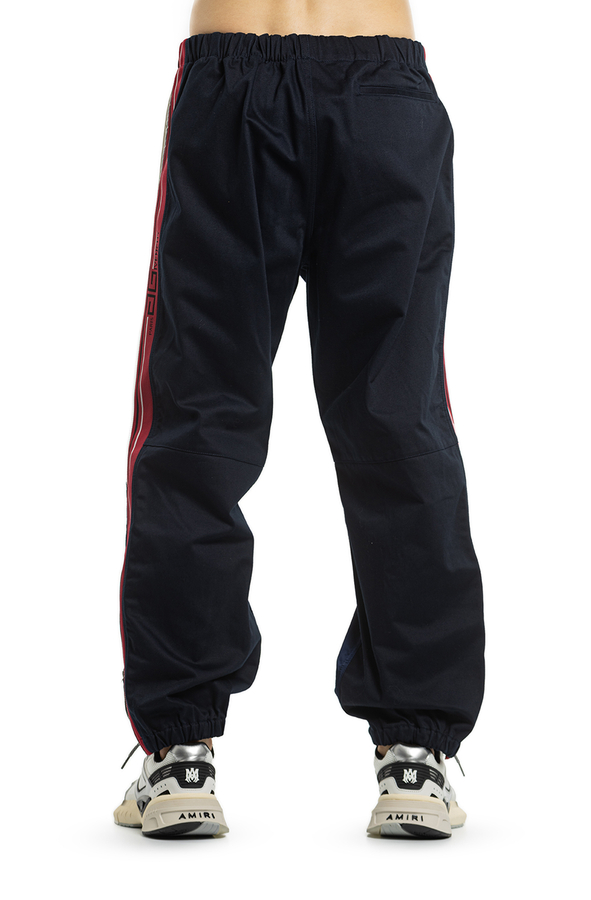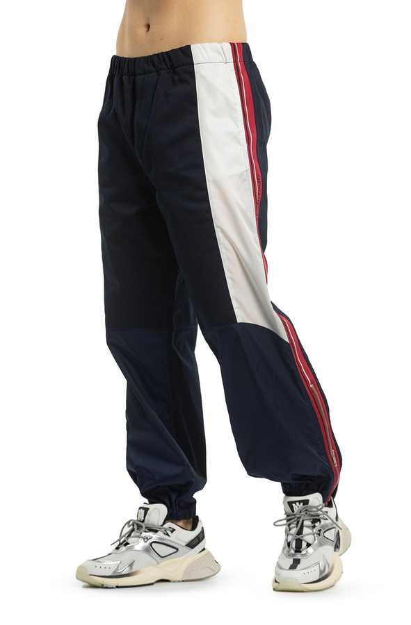 - Спортивні штани з бавовняної саржі з фірмовою прошивкою на бічних швах і нейлоновою обшивкою нижче коліна. Дві бічні вхідні кишені на блискавці та задня прорізна кишеня і манжети на блискавці.