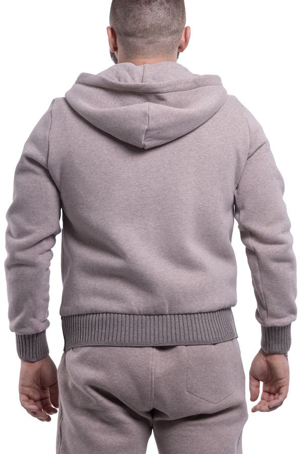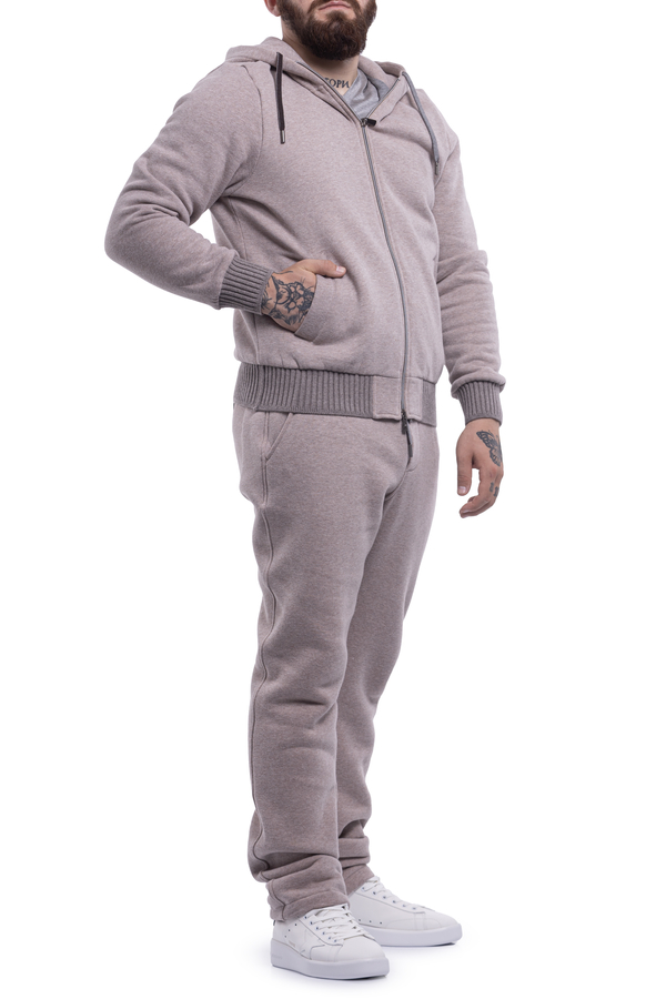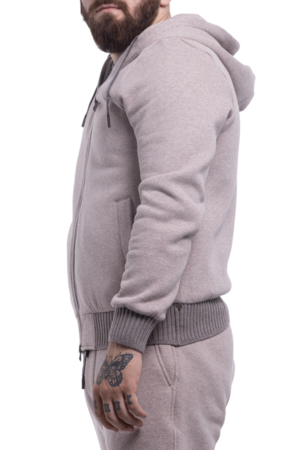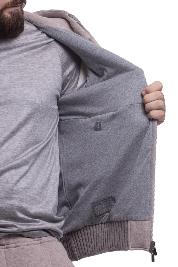 - Спортивна кофта з капюшоном, еластичні манжети та низ, застібка на подвійну блискавку спереду, дві прорізні кишені по боках