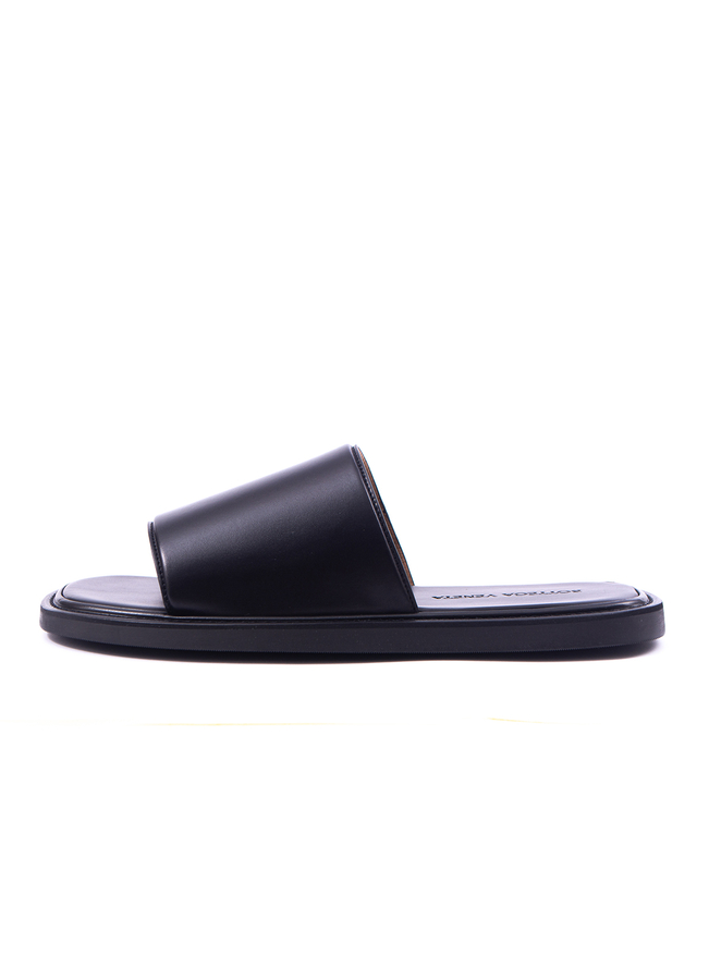 - Шкіряні шльопанці з відкритим носком. Відкритий носок, устілка з логотипом, плоска гумова підошва і модель без застібки.