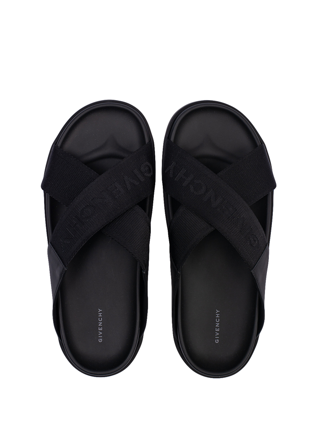 - Шльопанці із перехрещеними зверху ремінцями, прикрашеними фірмовим друкованим логотипом, гумова підошва, покрита м'якою шкірою з фірмовим написом GIVENCHY