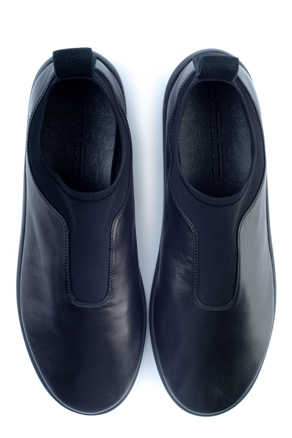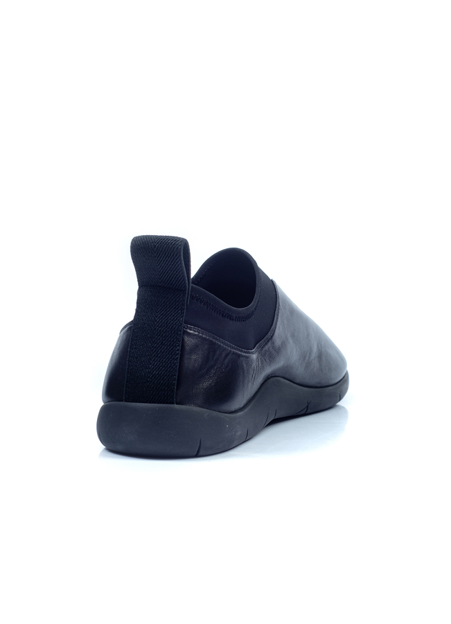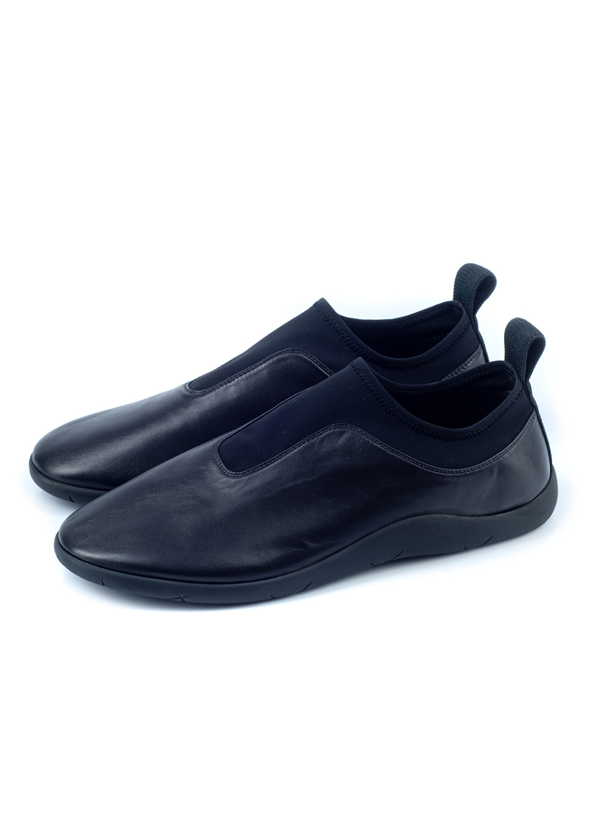 - Сліпони чорного кольору, шкіряний верх з деталями з еластану на язичку/ щиколотці, петля на п'яті, закруглений носок, резинова підошва, відстрочка в тон.