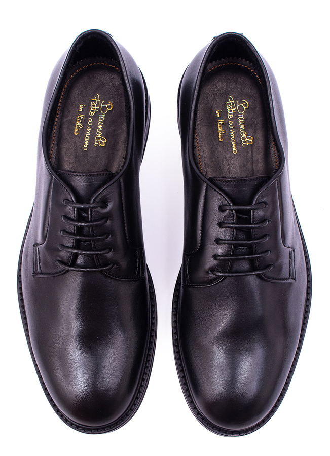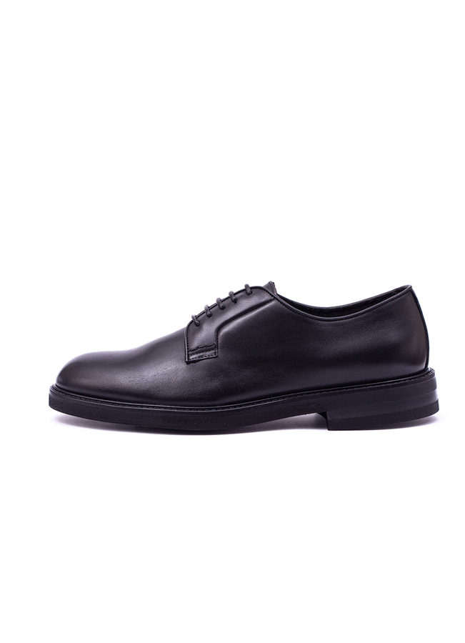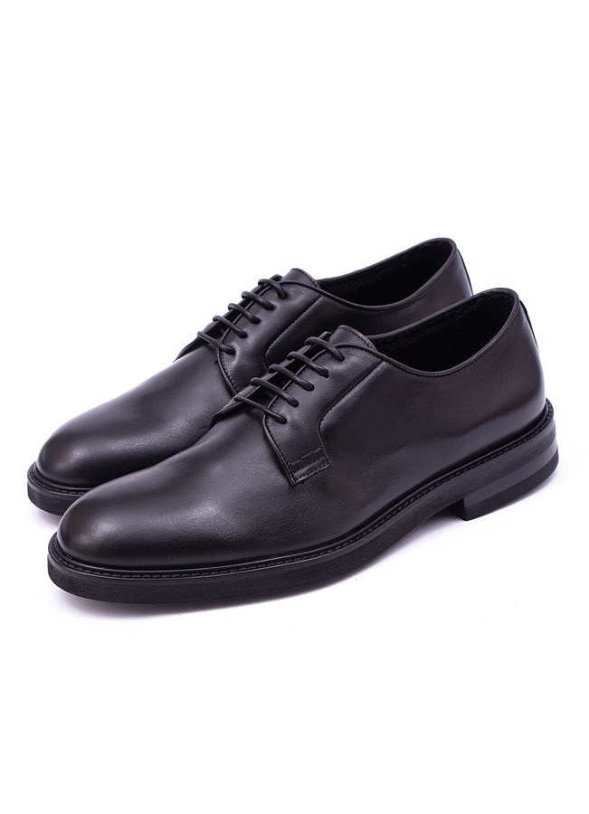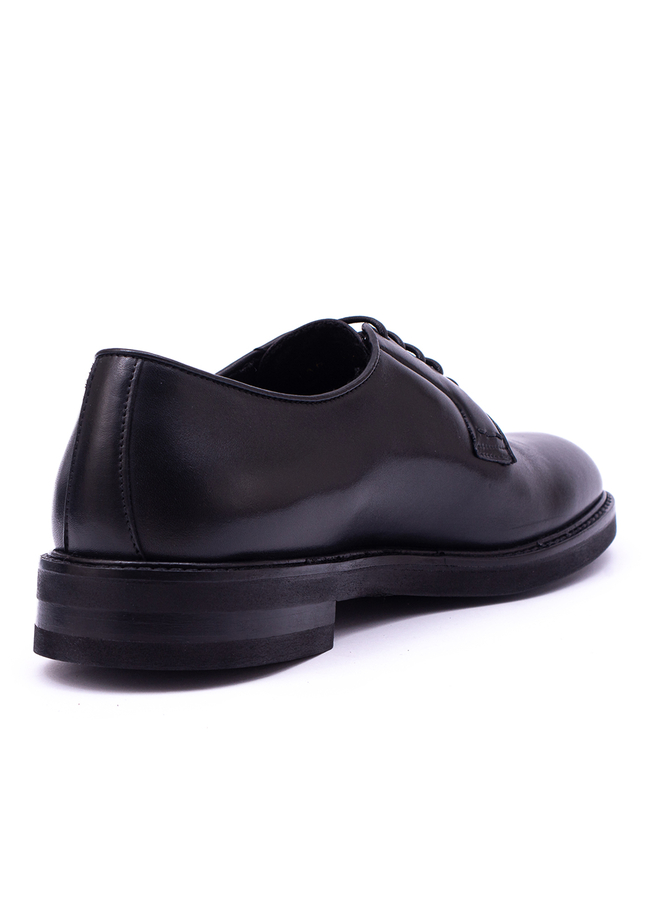 - Шкіряні туфлі-дербі з гладкої шкіри, застібка на шнурках.
