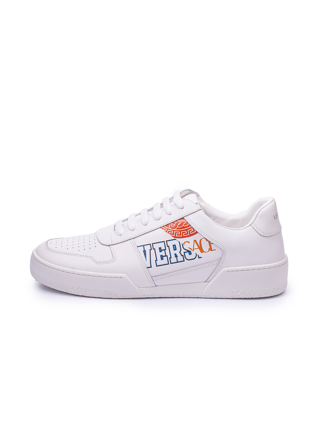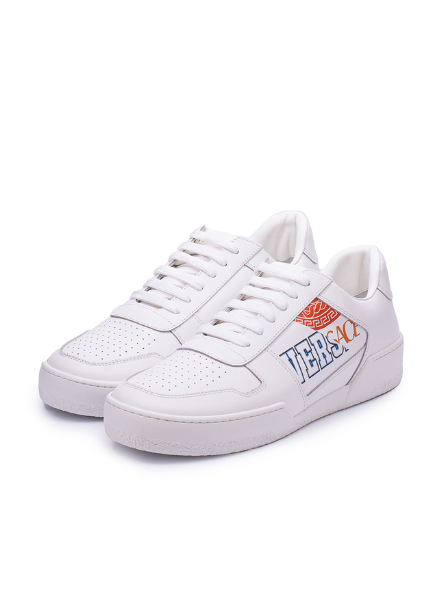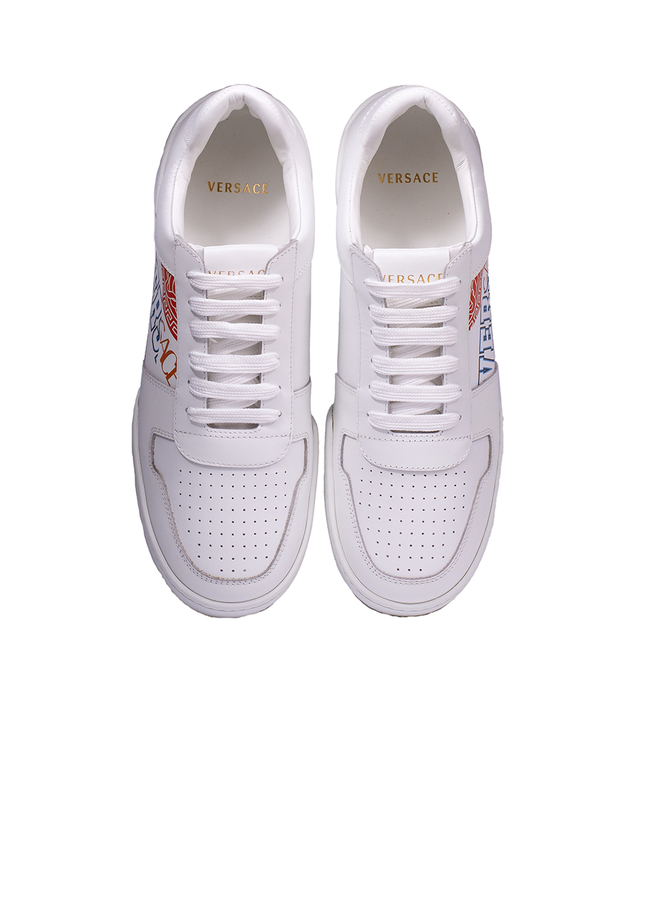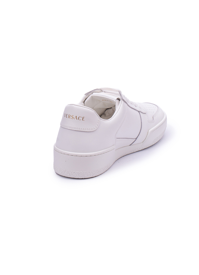 - Ці кросівки Versace виготовлені з білої шкіри та мають логотип. Має кріплення на шнурівці спереду, декоративні перфорації, круглий носок і плоску гумову підошву.