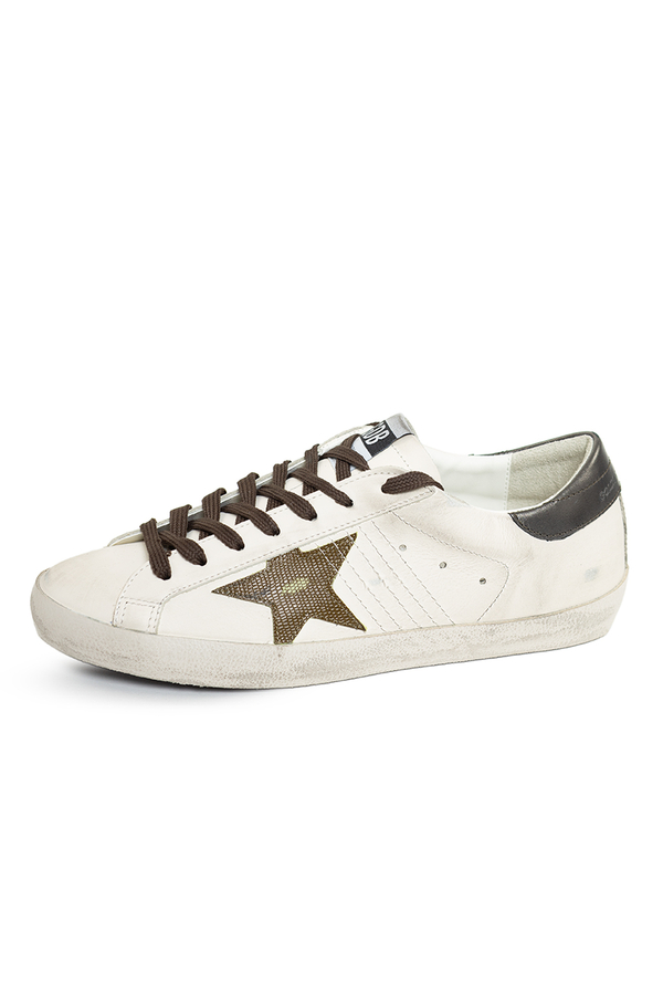 - Шкіряні кросівки з ефектом потертості, круглий носок, спереду контрастна шнурівка, серебриста вставка з логотипом на п’яті, етикетка з логотипом на язичку, фірмова зірка збоку