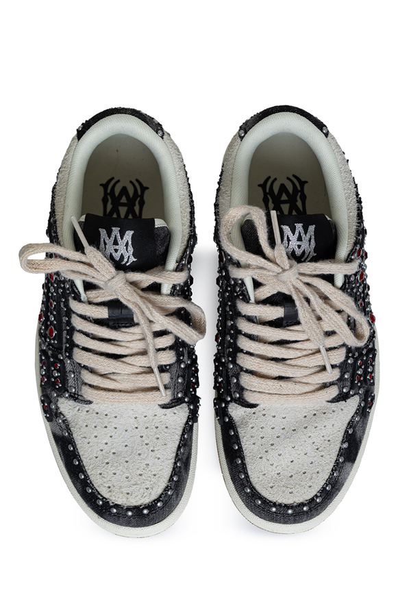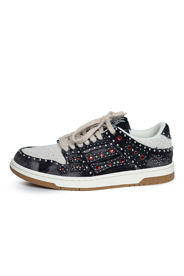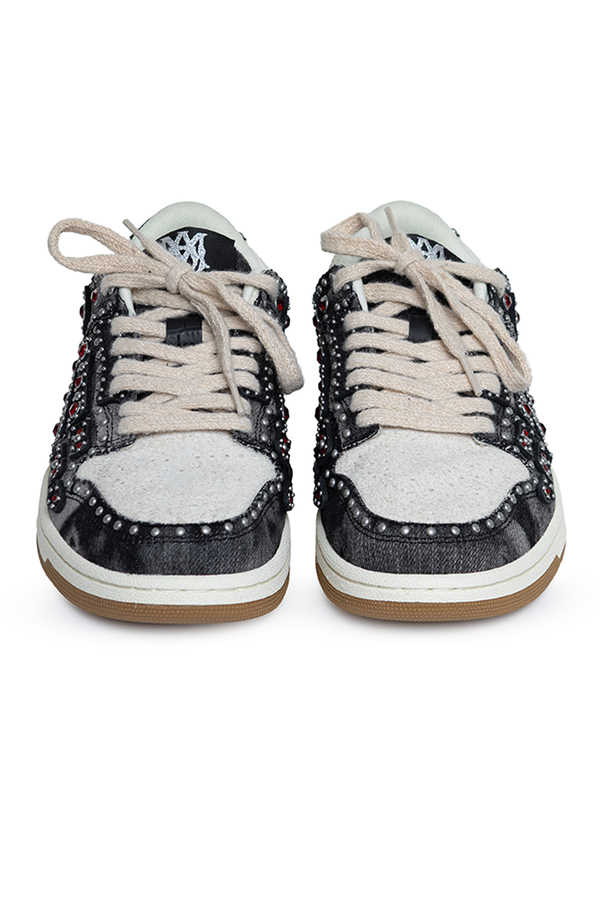 - Кросівки з декоративними заклепками, спереду шнурівка, круглий носок, нонограма на язичку та задній панелі, контрастна підошва