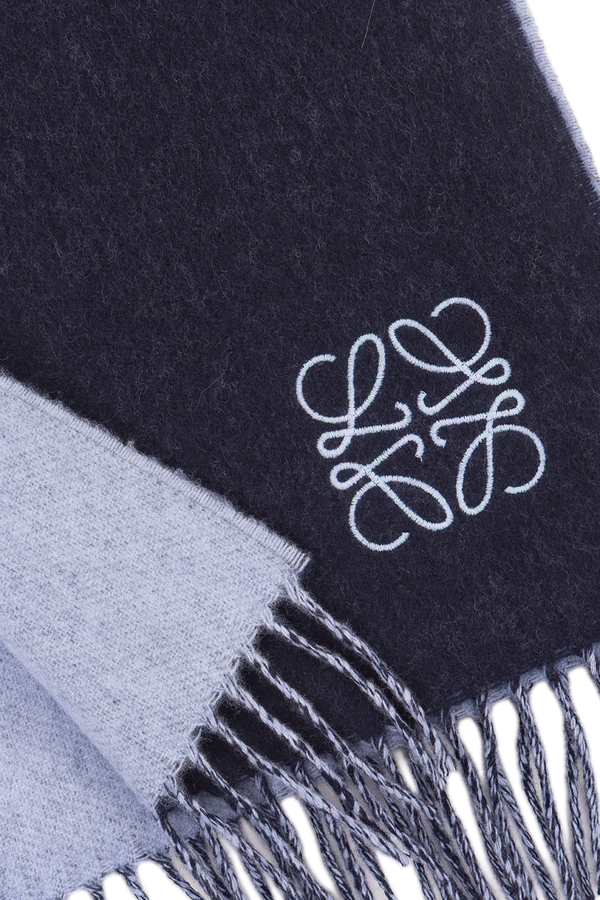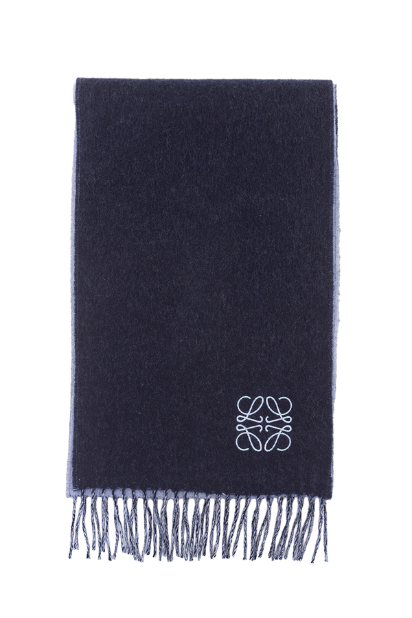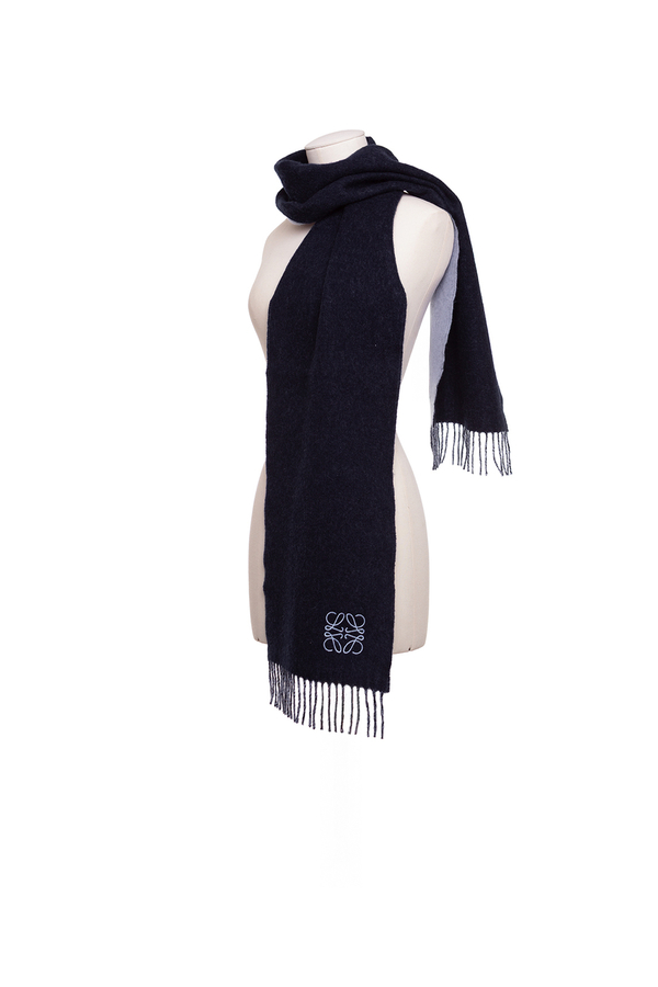 - Двосторонній шарф із суміші вовни та кашеміру, краї оздоблені бахромою, вишивка анаграми внизу