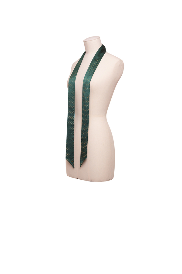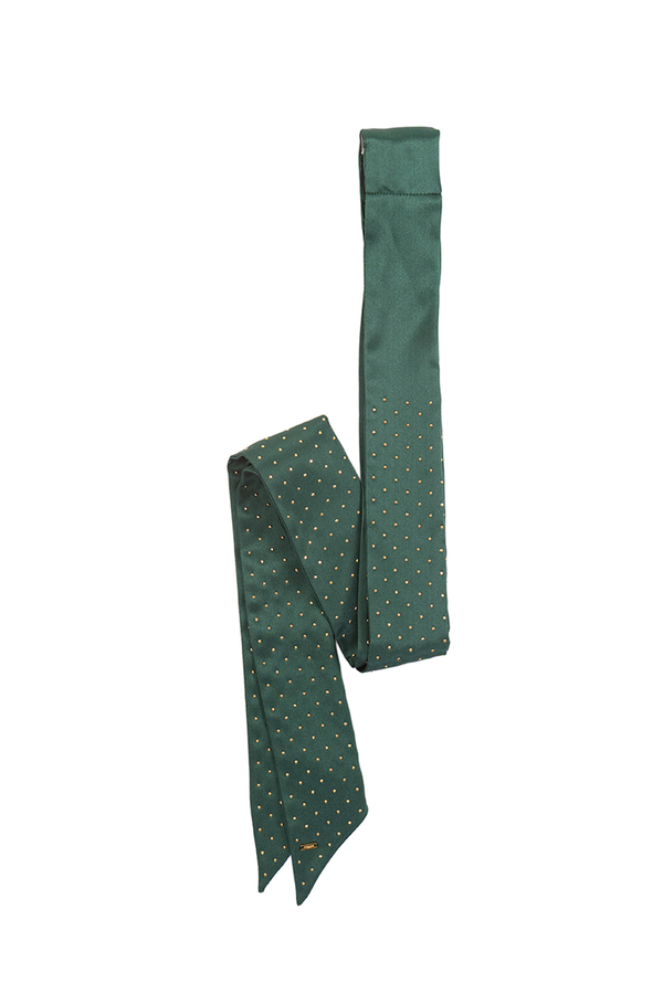 - Шовковий вузький шарф із заклепками. Загострений кінець та пряжка з логотипом спереду.