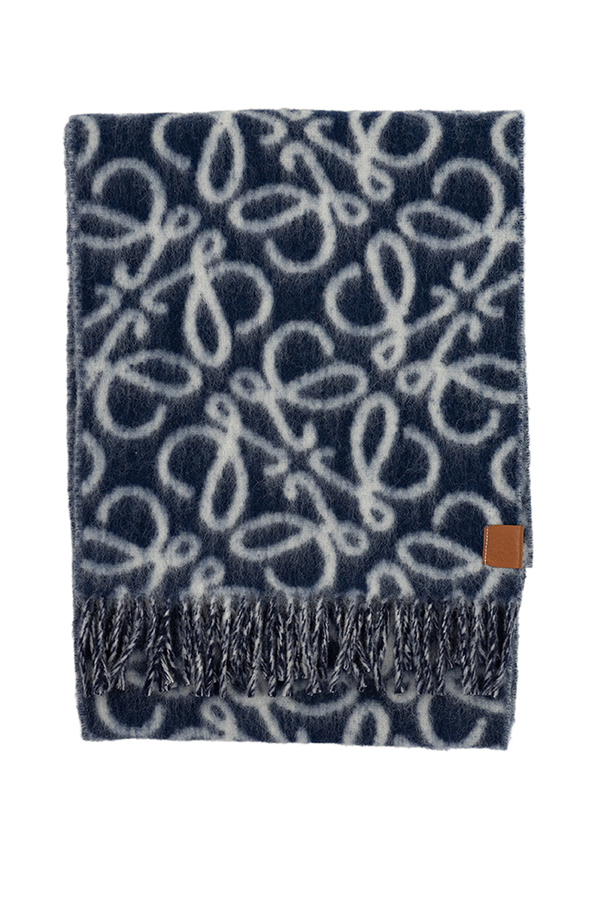 - Довгий шарф з візерунком анаграми по всій поверхні, краї оздоблені бахромою, шкіряна етикетка з тисненням анаграми внизу
