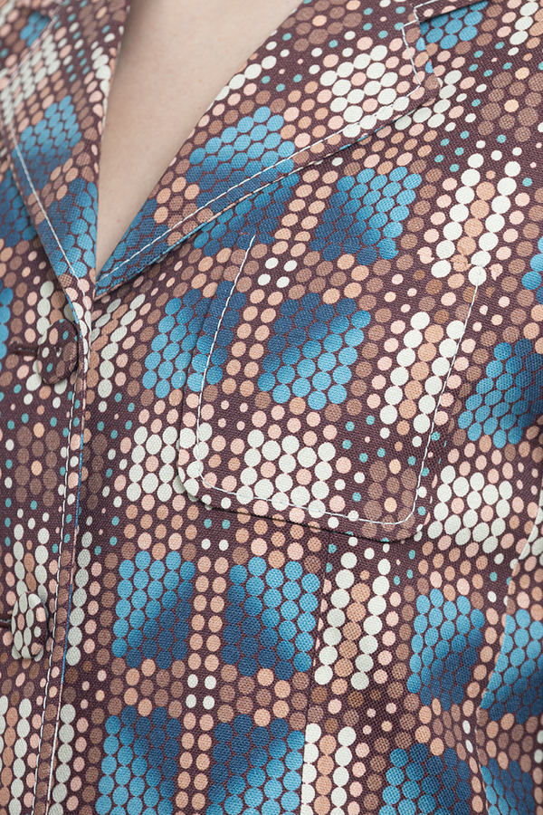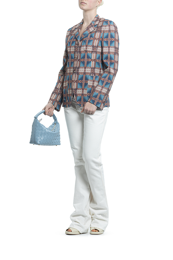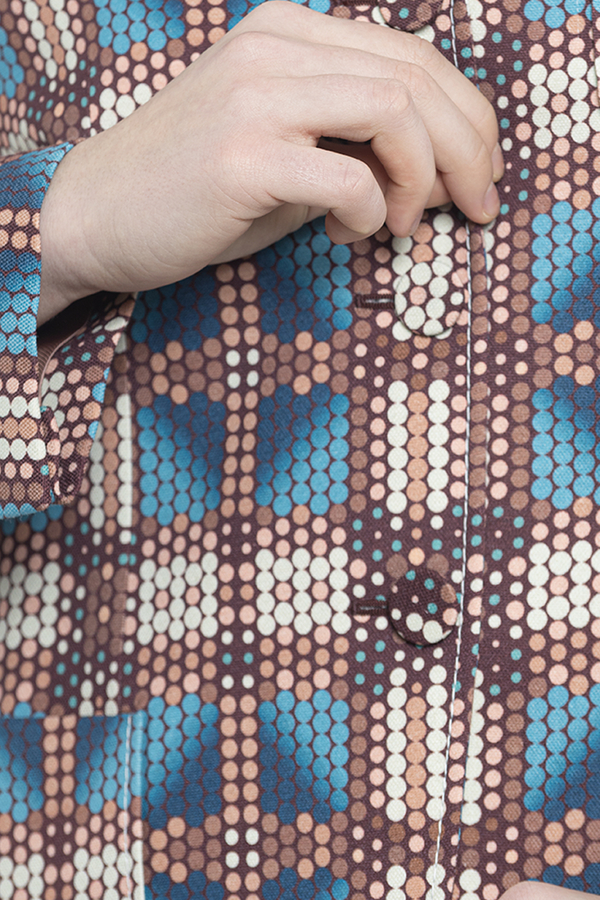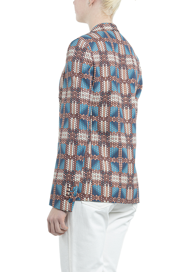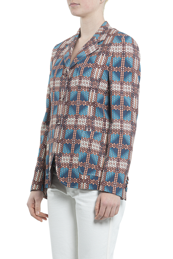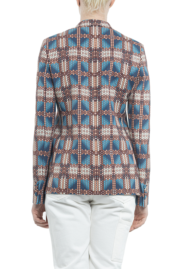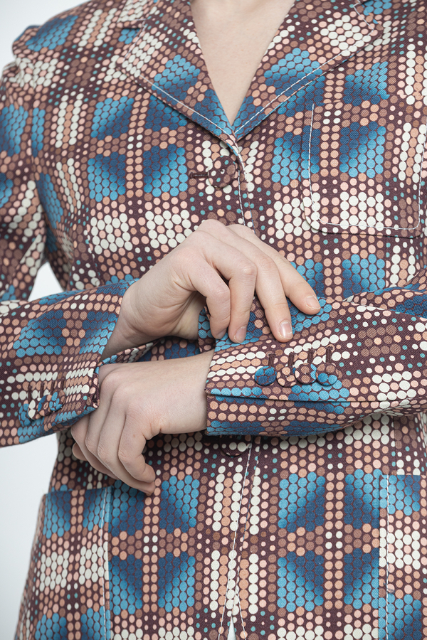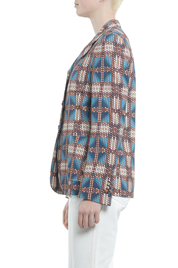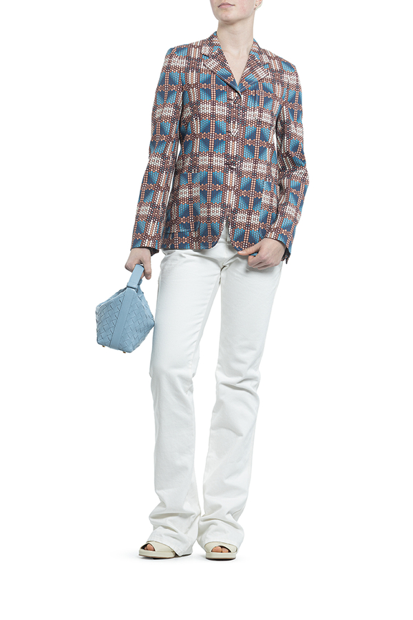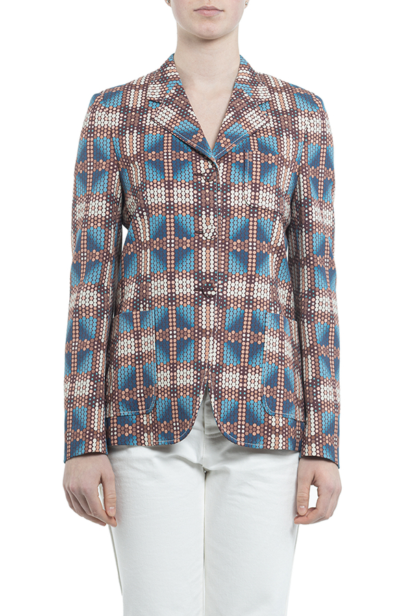 - Однобортний жакет з довгими рукавами і застібкою на три гудзики. Відкладний комір з гострими лацканами. Геометричний візерунок по всій поверхні. Дві великі накладні кишені спереду.