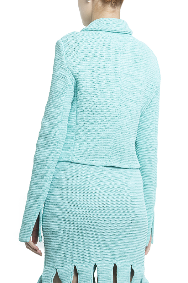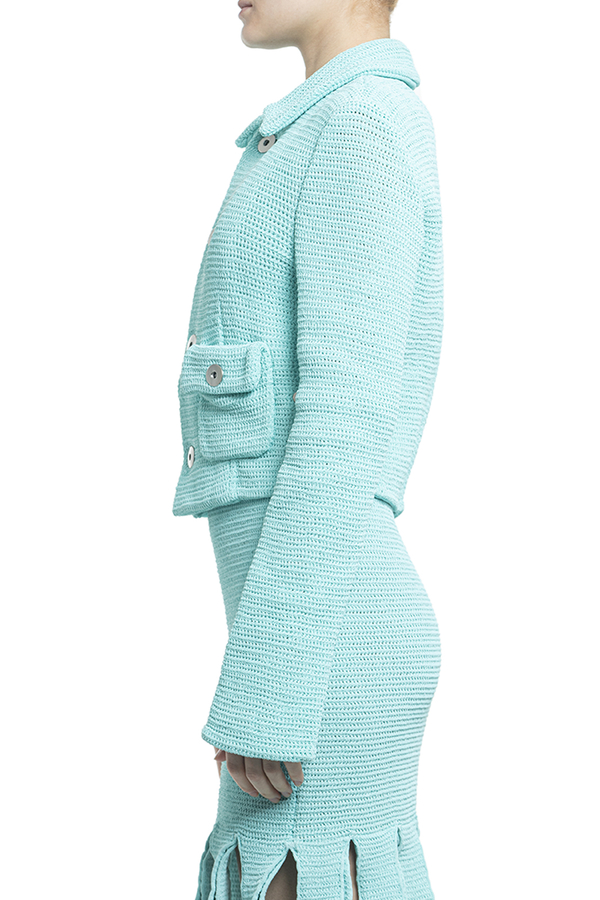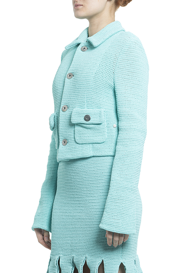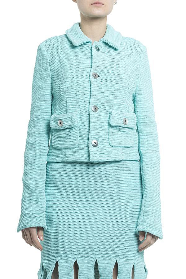- Укорочений жакет. В'язаний дизайн, еластична модель, класичний комір, довгі рукави, укорочена довжина, застібка на ґудзиках спереду і дві кишені на гудзику з боків.