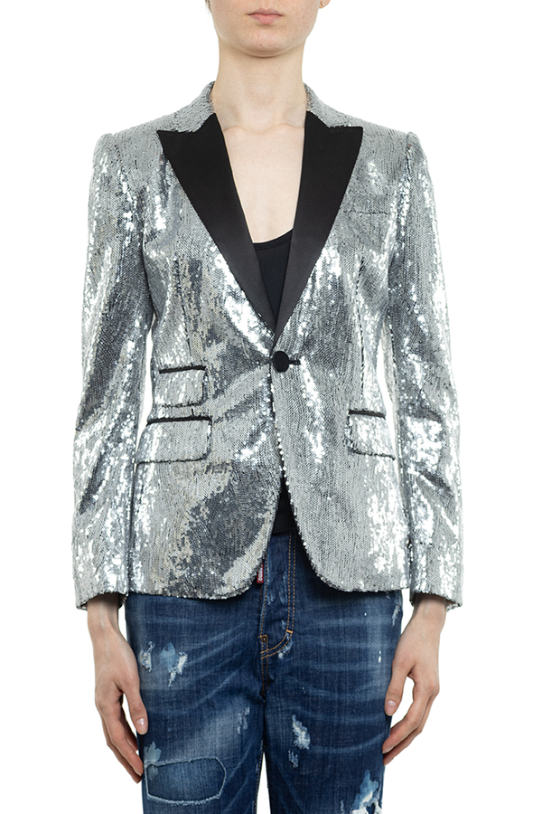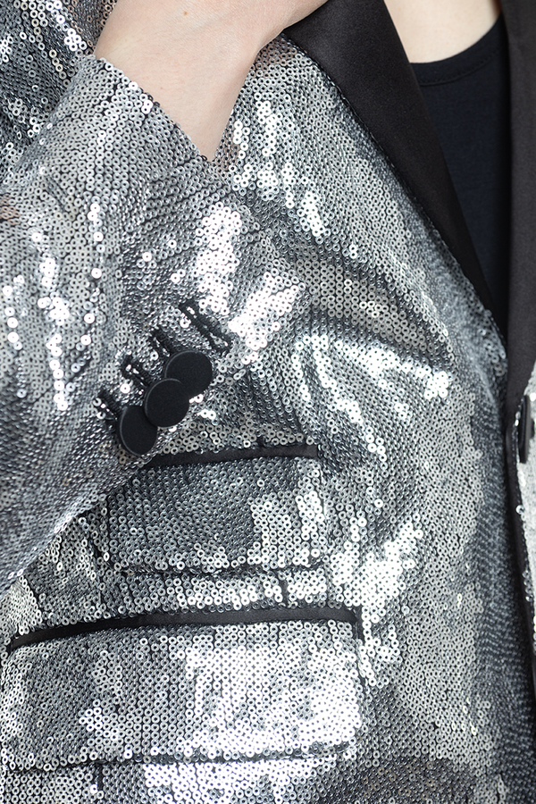 - Приталений блейзер повністю розшитий блискучими сріблястими паєтками. Відкритий комір, передні кишені з клапанами, структуровані плечі та закруглений поділ. Застібка на один гудзик.
