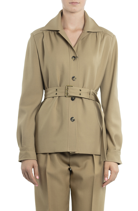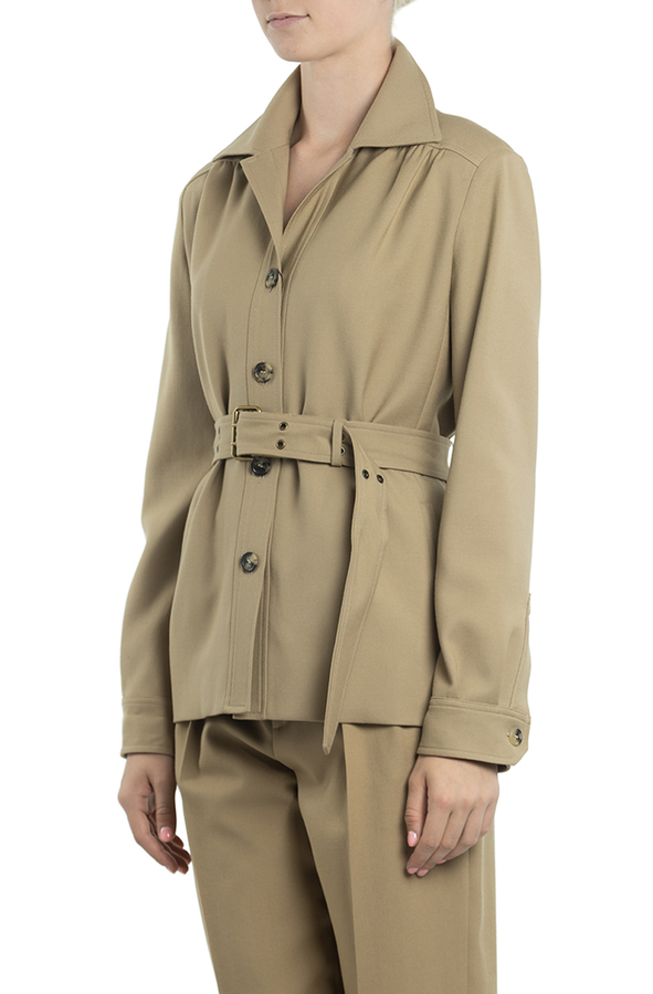 - Жакет зі зйомним поясом, відкладний комір, спереді та на манжетах гудзики, по боках кишені.